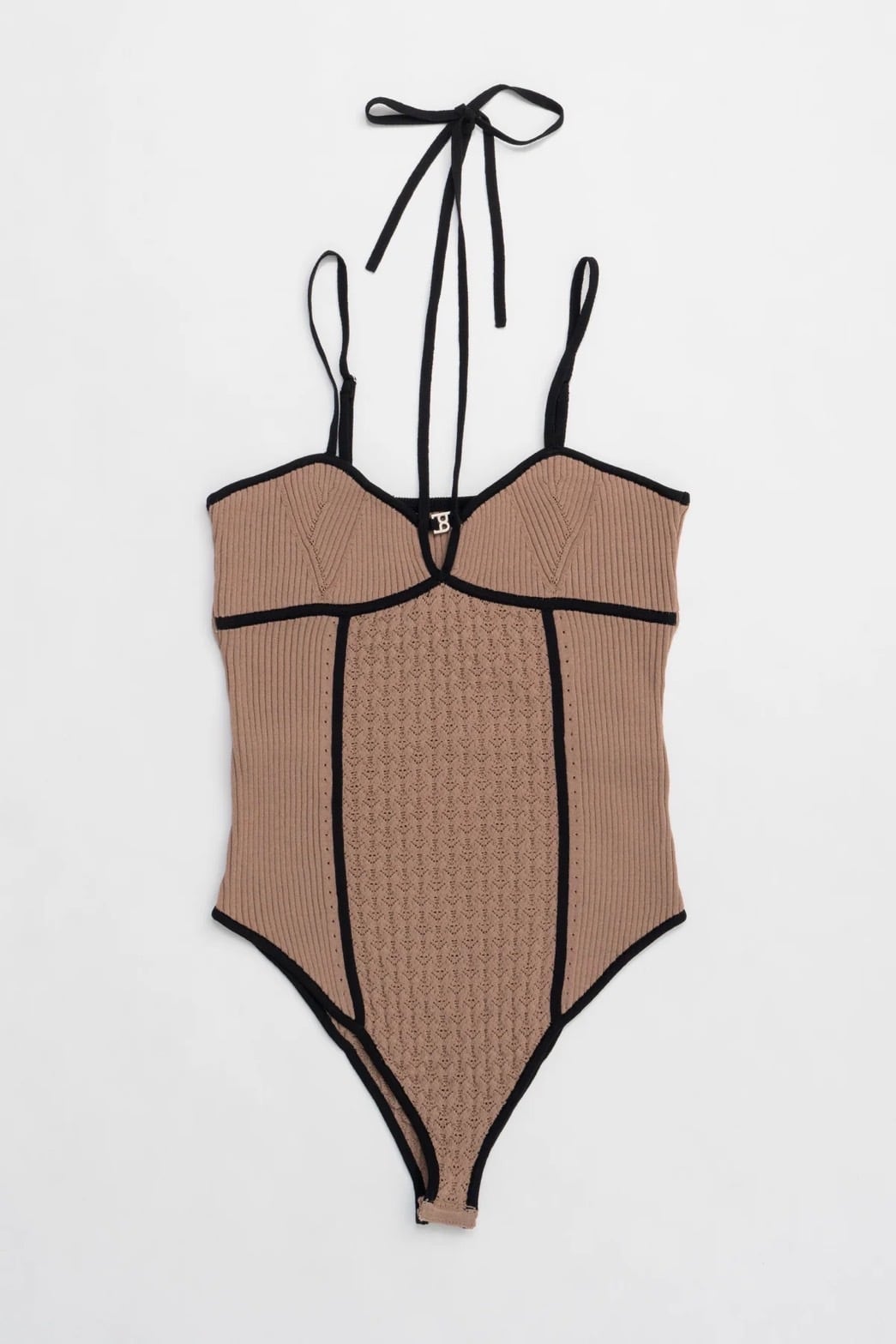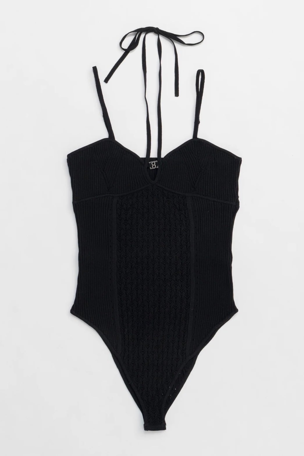ビスチェのようなシームラインがアクセントのニットボディスーツ。