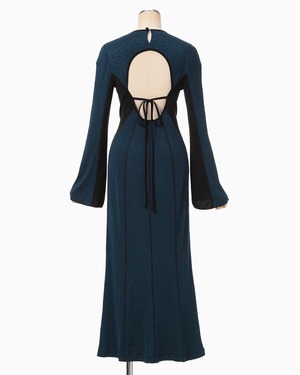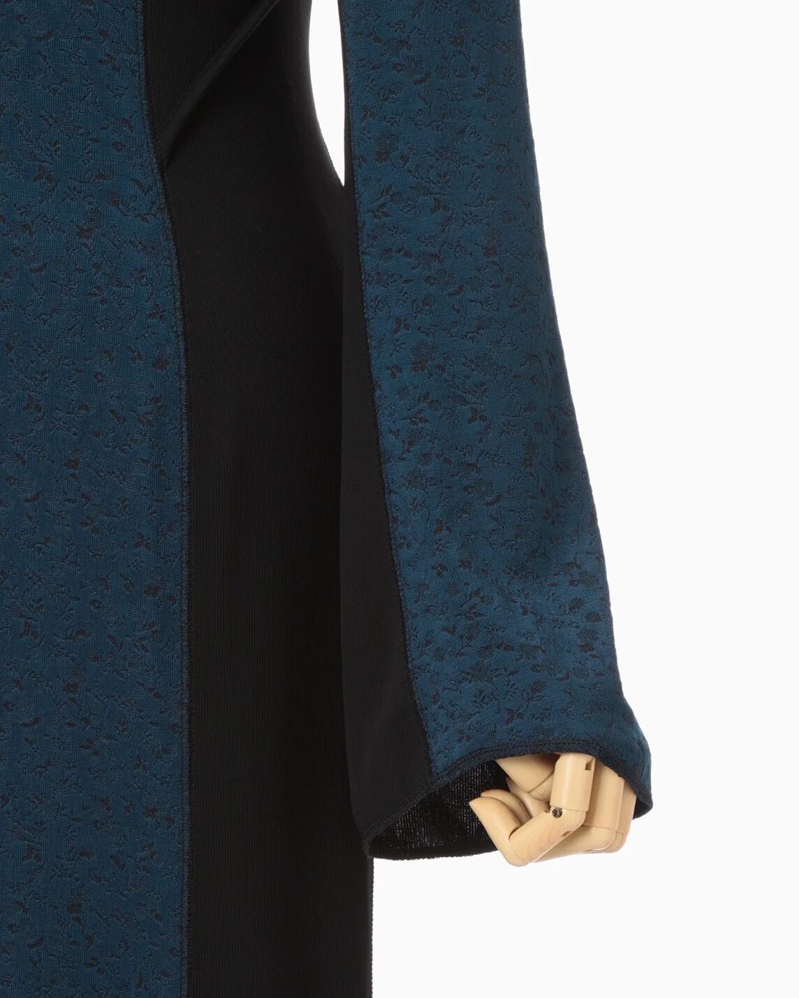 レーヨンをベースにナイロンポリウレタンの糸で小花柄を表現することで、柄の部分に収縮が生まれ凹凸を出すことで立体的な奥行きのある表情に。しなやかなジャージー素材が心地よく身体に寄り添い、大胆に開いた背中の開きとフィットアンドフレアのシルエットがセンシュアルな印象を与え、デイリーに着用しやすく、汎用性のある1着。