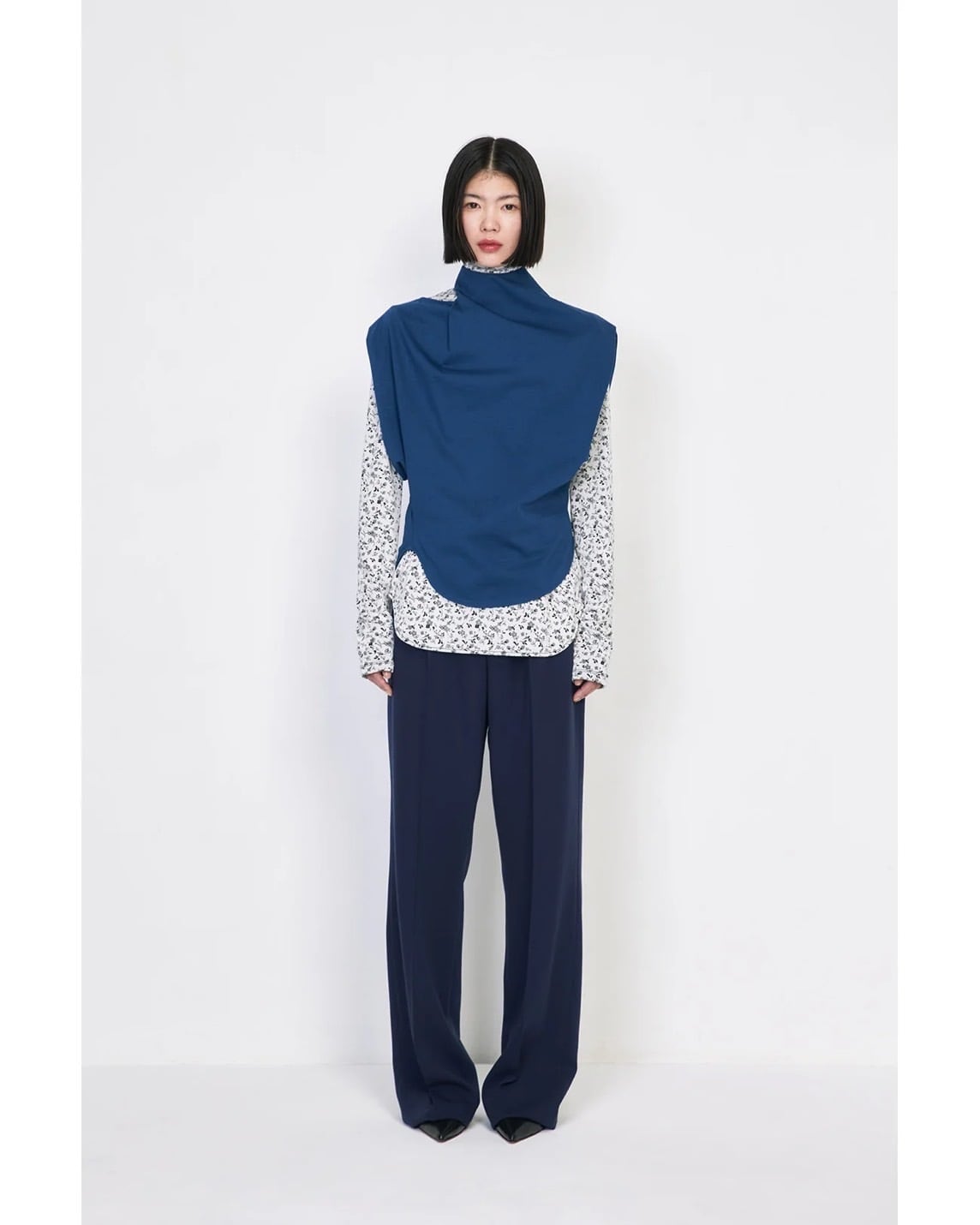 レーヨンをベースにナイロンポリウレタンの糸で小花柄を表現することで、柄の部分に収縮が生まれ凹凸を出すことで立体的な奥行きのある表情に。しなやかなジャージー素材が心地よく身体に寄り添い、シンプルなシルエットとサラッとした生地感が通年着用しやすく、レイヤースタイルやあらゆるボトムスと高相性で汎用性のある1着。
