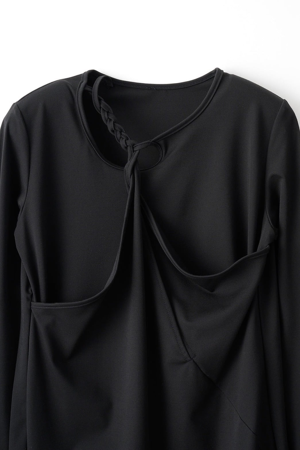 アシンメトリーな首元の編み込みが繊細なラインを美しく上品に演出する。