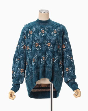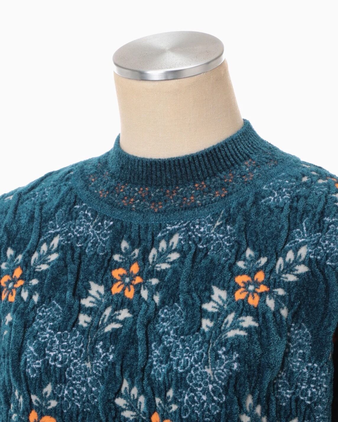 極細モール⽷とハイストレッチ⽷を組み合わせることで、特徴的なうねりと膨らみを表現し、キルティングのような風合いに。リブ部分に小花柄をあしらったノスタルジックで表情豊かな配色のニットトップは、しっかりとした肉感とざっくりとした着用感がリラックスムードを叶える1着。