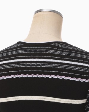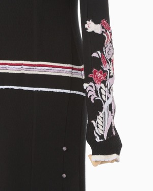 ハイストレッチ糸を使用し、ピンタックの内部に大胆な花柄がステッチのように現れるデザイン。柄部分には極細のモール糸など異素材を組み合わせ、テクスチャーに奥行きをもたせている。ピンタックの配色が上品さと華やかさを添え、裾のボタンの開閉によってスリットの位置調整が可能。ボトムスを重ねたレイヤードスタイルにも対応し、カジュアルからエレガントまで、幅広いスタイリングに寄り添う一着。