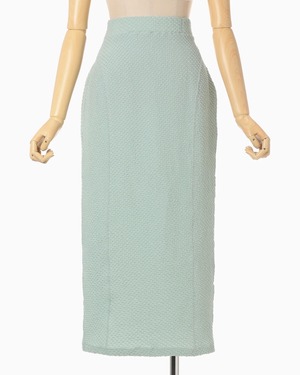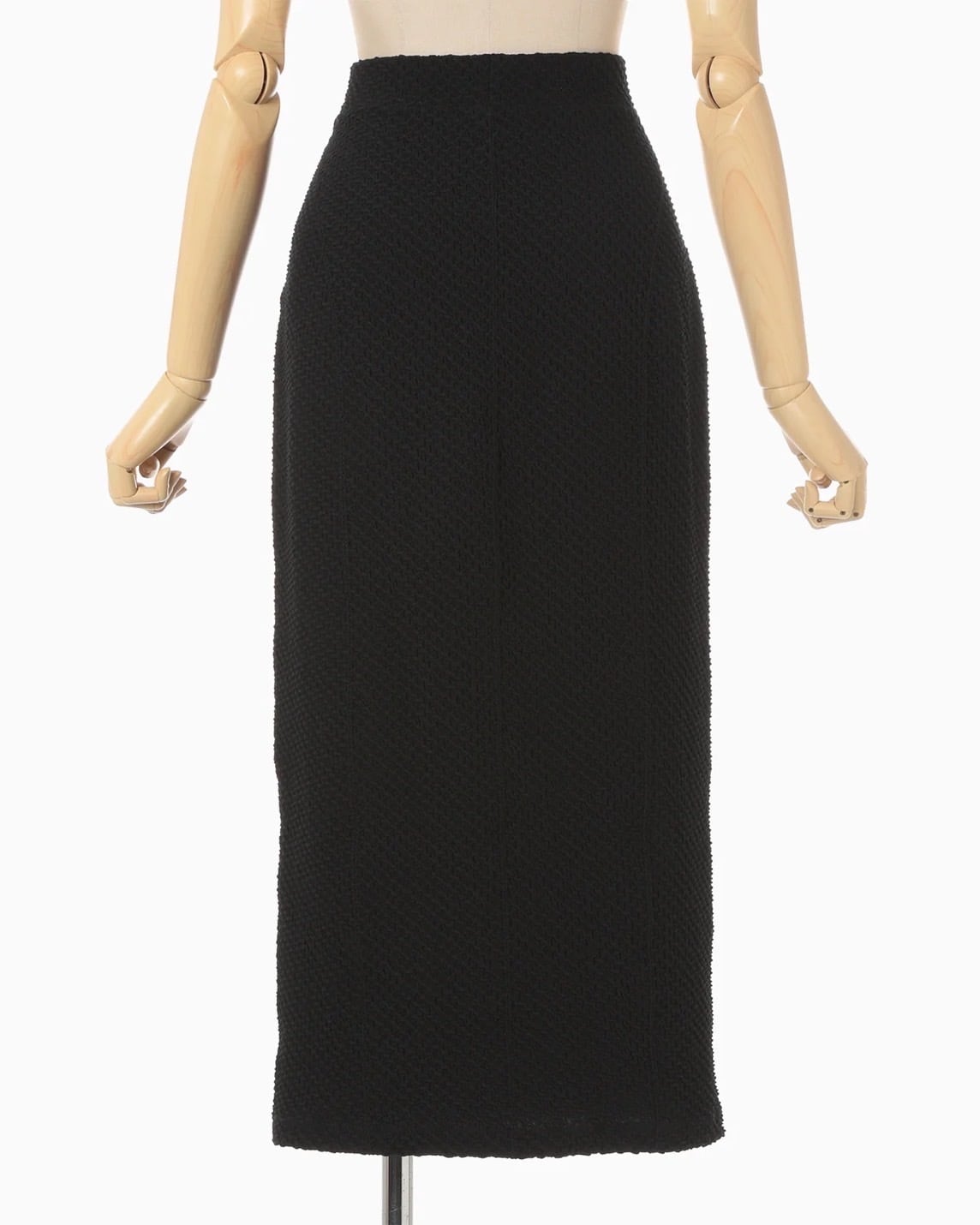 ポリウレタンをポリエステルでカバーリングした伸縮性のある糸で柄を編むことで、立体感のある表情に。新たなデザインで登場したペンシルスカートは、ストレッチ性のある素材とウエストゴムのデザインがリラックスムードを叶え、縫い代をステッチで抑えることによる、滑らかなフィッティングとすっきりとしたシルエットがカジュアルになりすぎない上品さを実現。縦のラインを強調しメリハリのある着こなしを可能にする。