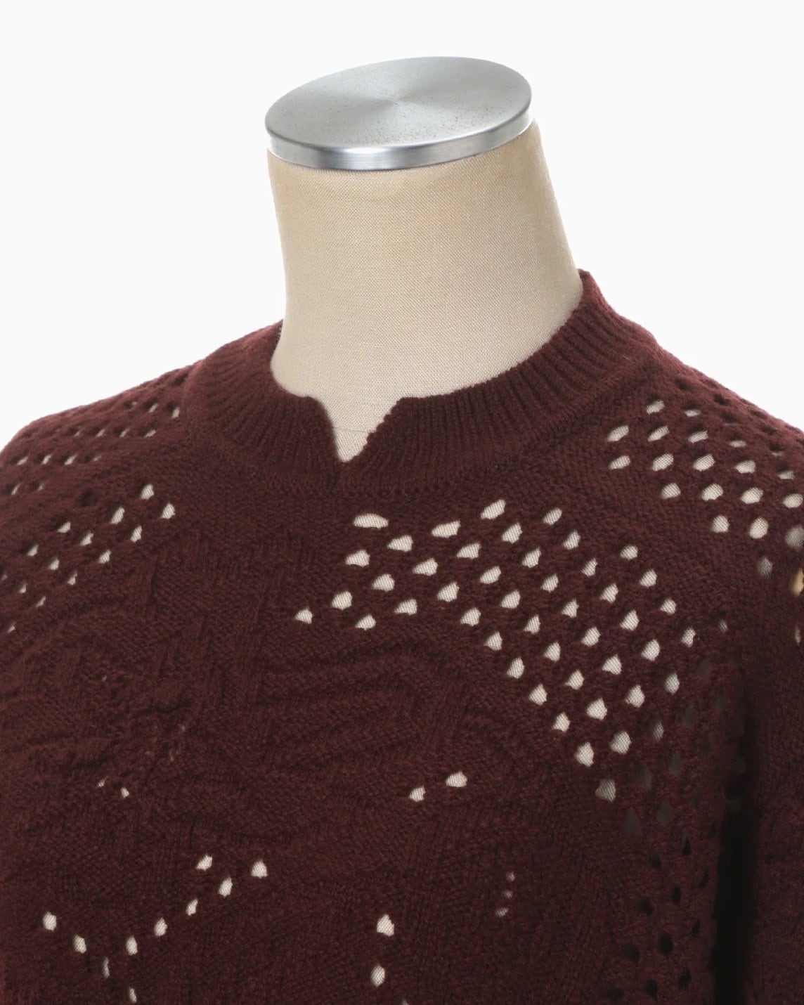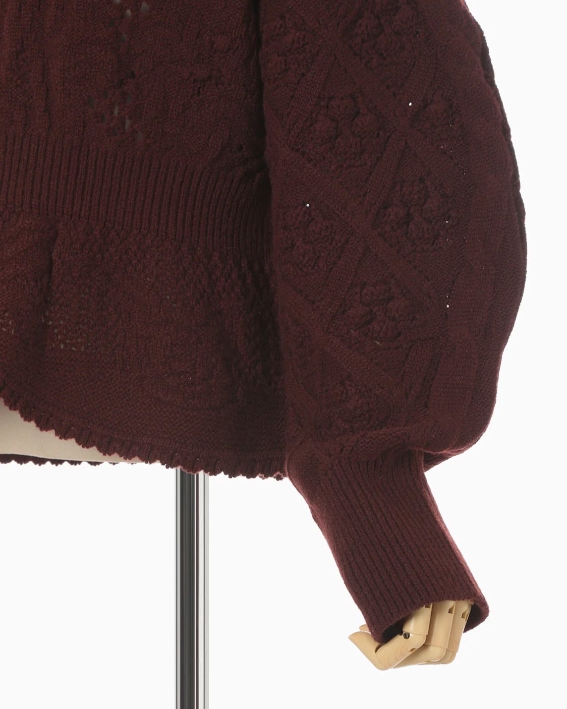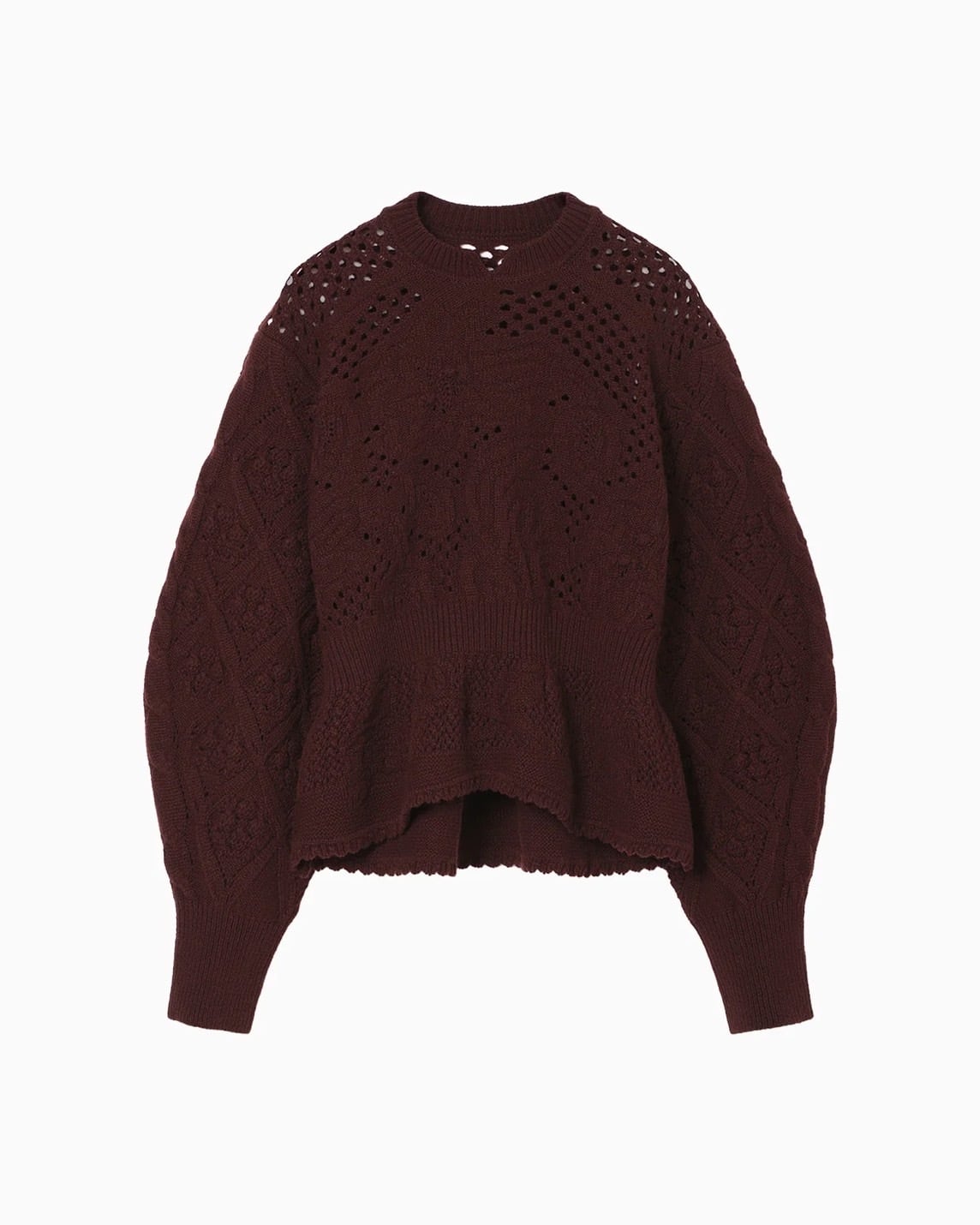 肌触りが柔らかく軽やかなニットは、異なる編み組織を複雑に組み合わせながら胸元には花柄、裾や袖にはレース柄、袖の中心にはランダムケーブル柄を配した。フィットアンドフレアのシルエットとニュアンスカラーのバランスがリラクシングかつ上品な1着。