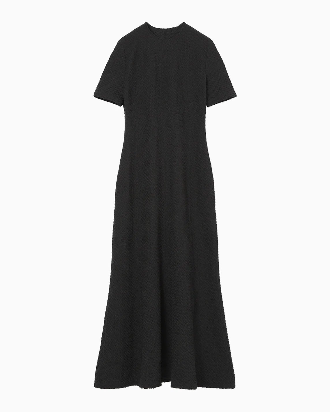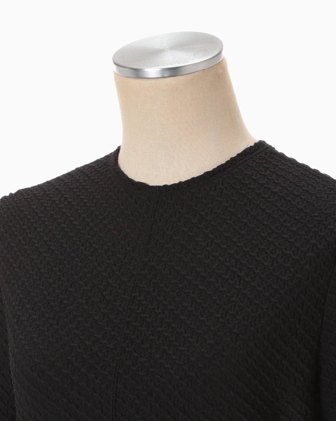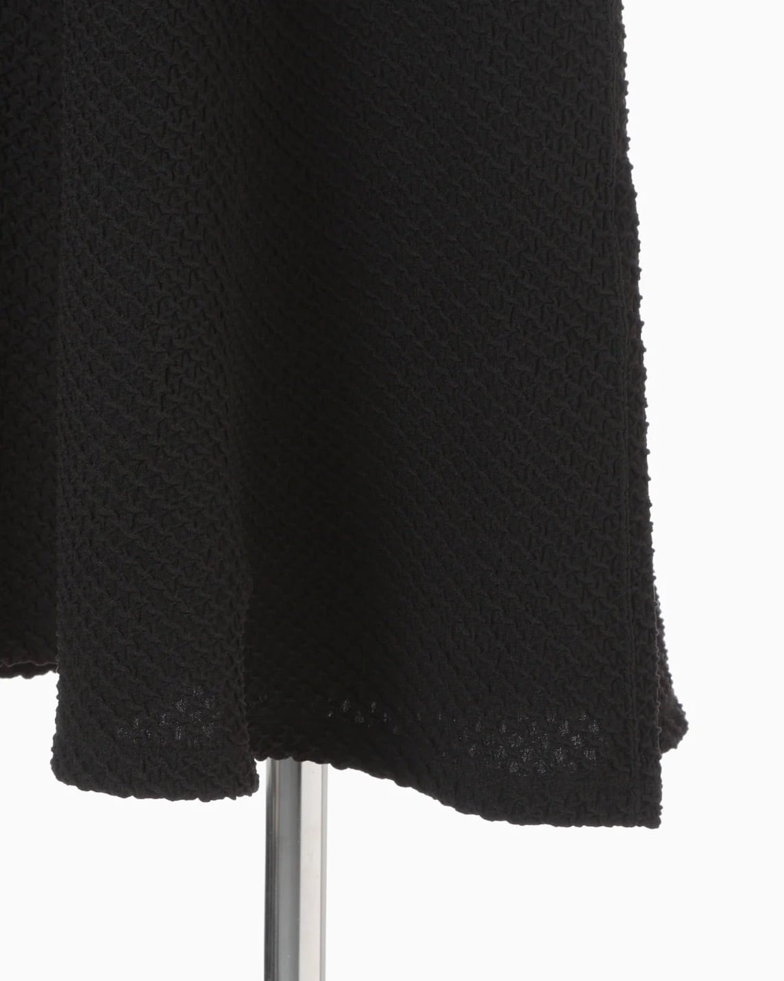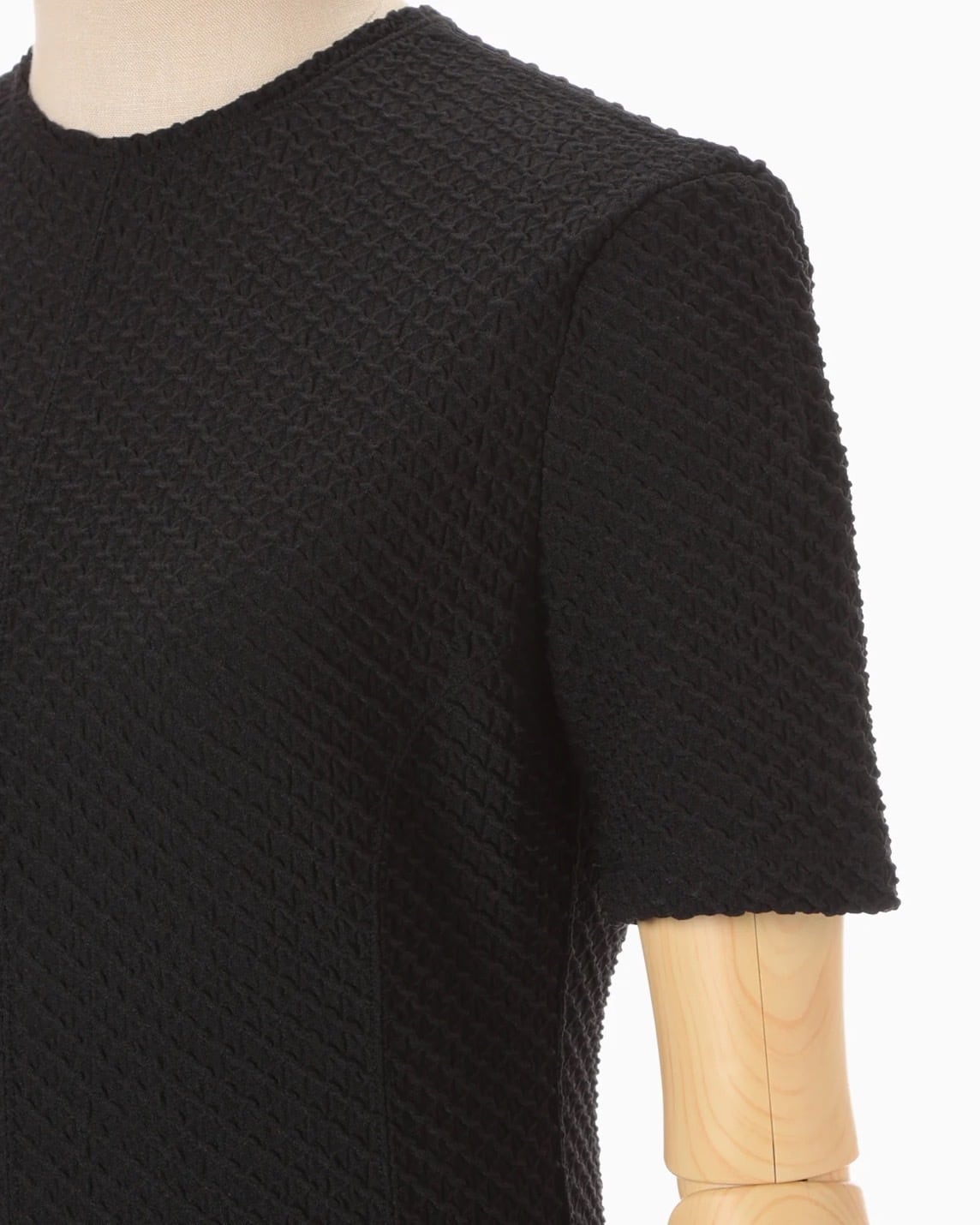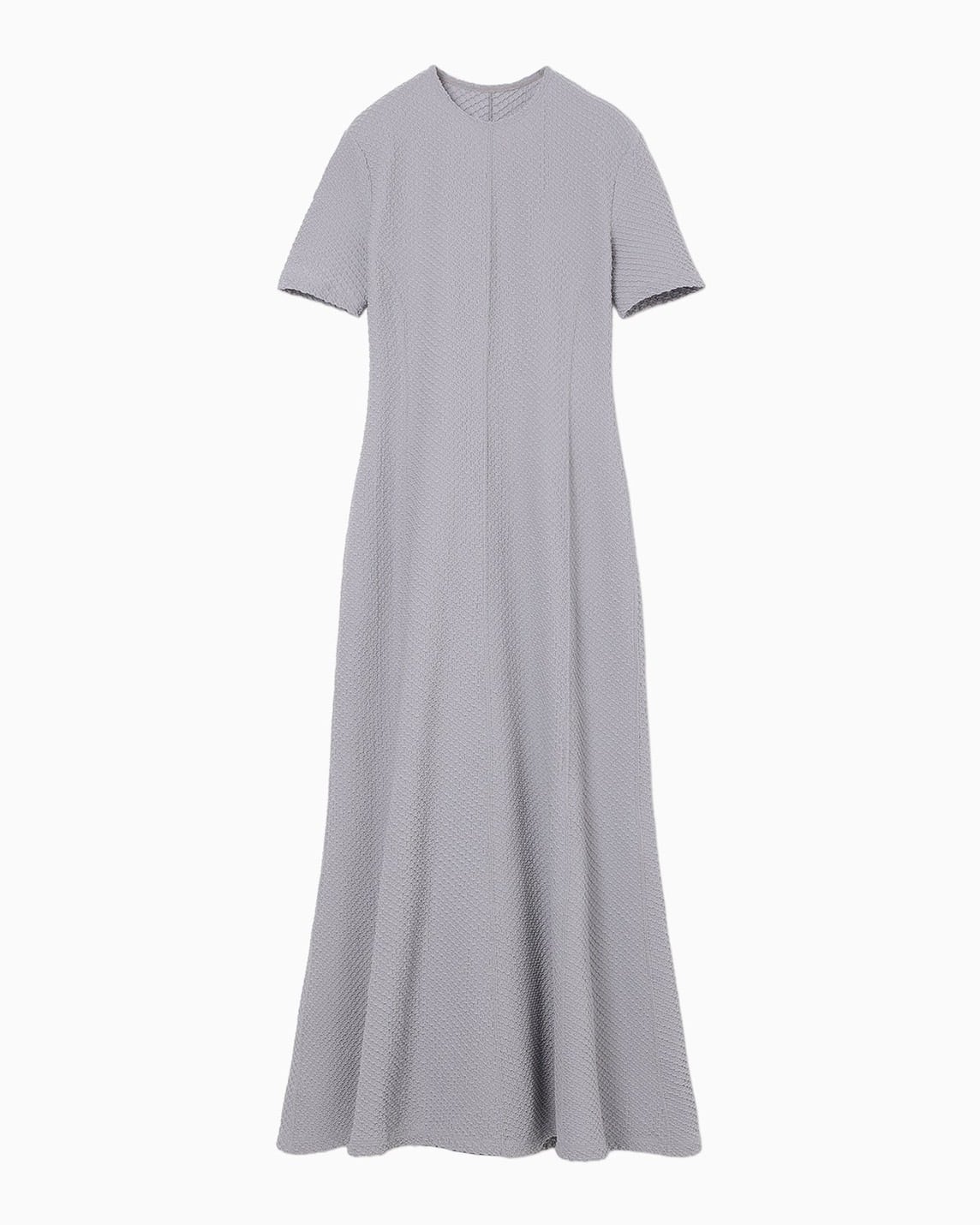 ポリウレタンをポリエステルでカバーリングした伸縮性のある糸で柄を編み立て、立体感のある表情に仕上げた。コンパクトな身頃と、分量感のあるフレアスカートが特徴で、腕まわりに優しくフィットする五分袖が汎用性を高める。縫い代をステッチで抑えることで生まれる滑らかなフィッティングが、カジュアルになりすぎない上品さを実現。フィットアンドフレアの美しいシルエットが際立つ1着。
