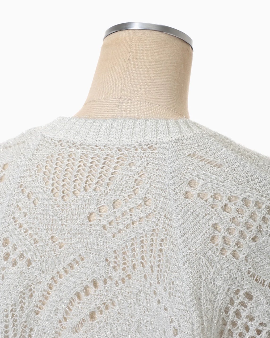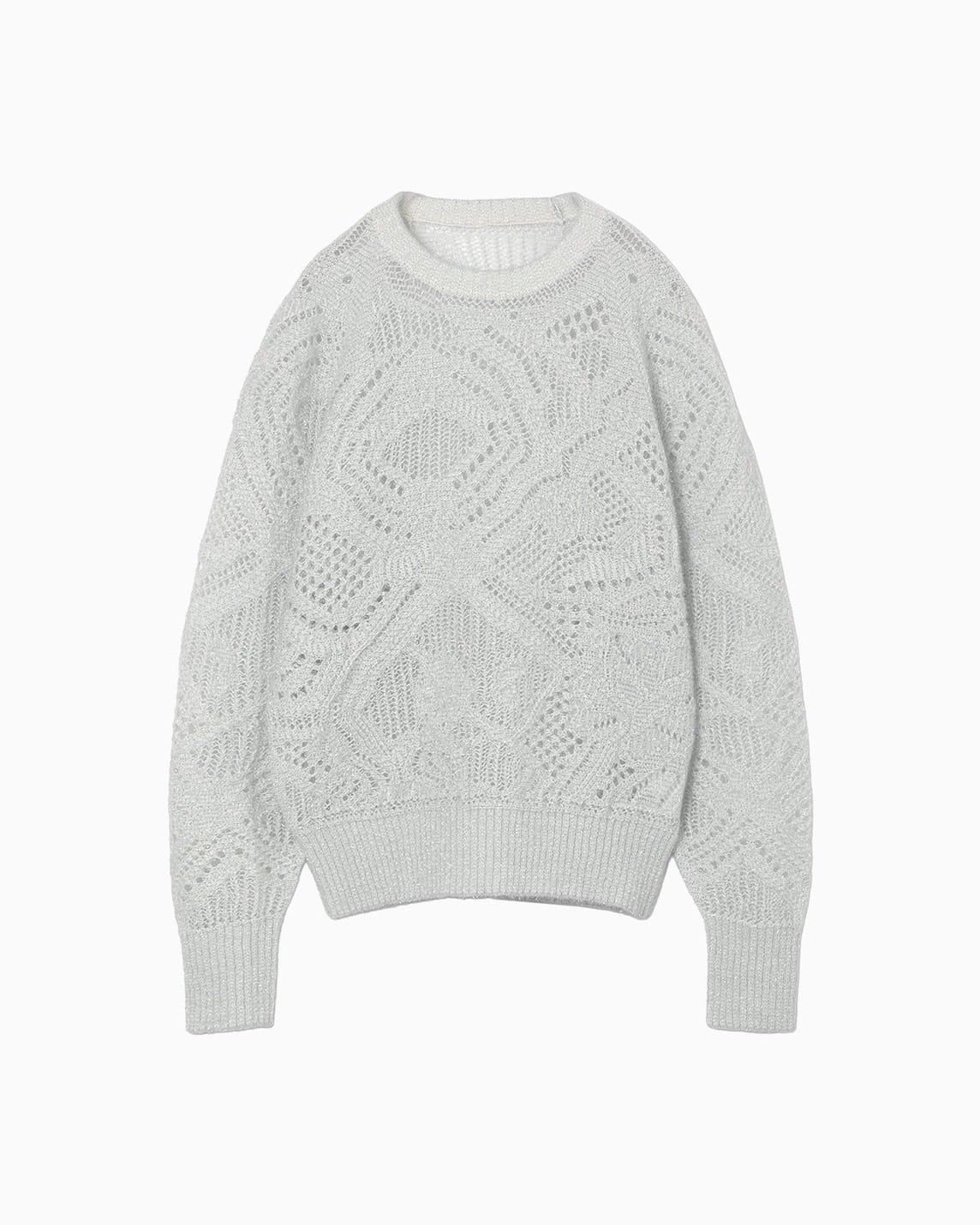 透明なナイロンフィルムと綿ポリエステルの糸で編み立てることでガラスの反射を表現し、構築的な柄の中にもやわらかく儚げな印象をプラスする。センシュアルなローゲージの透け、ラウンドシルエット、腰にかかるやや短めの着丈が、ドレスやカジュアルスタイルにもマッチする実用性に優れた1着。