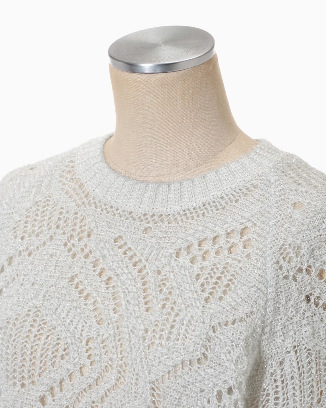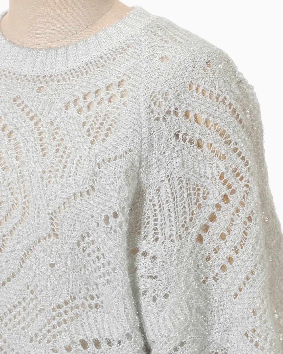 淡い光を纏うようなフィルムの煌めきが特徴のニットトップ。