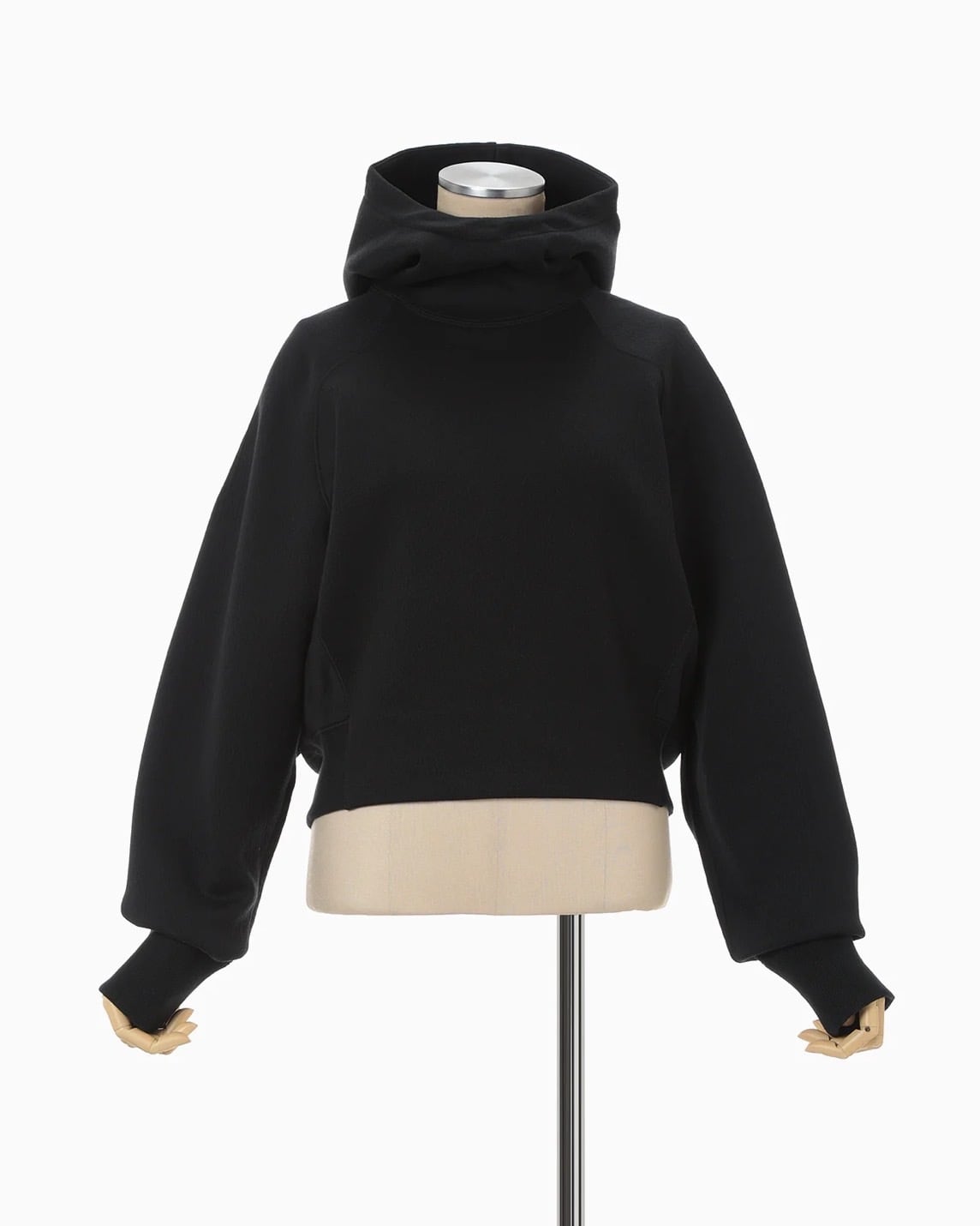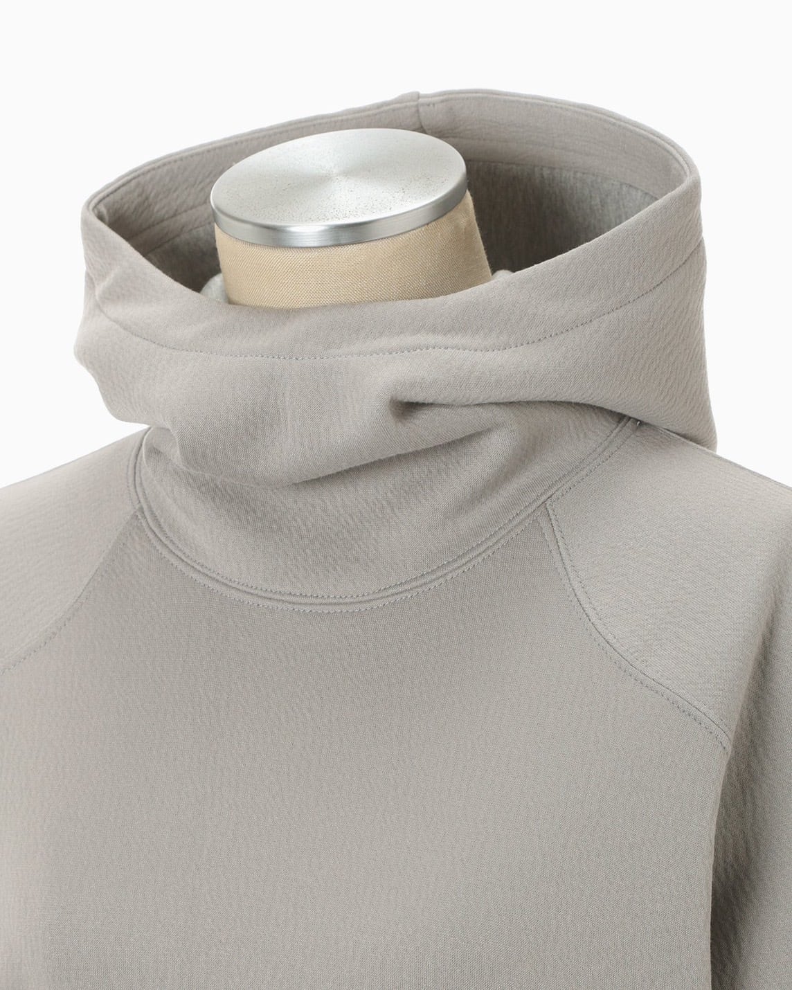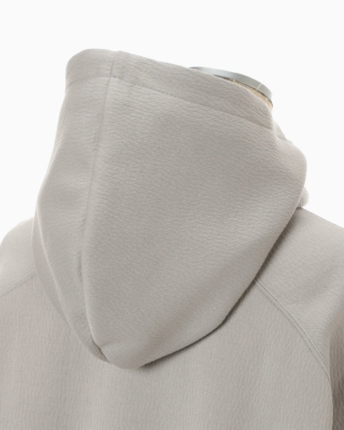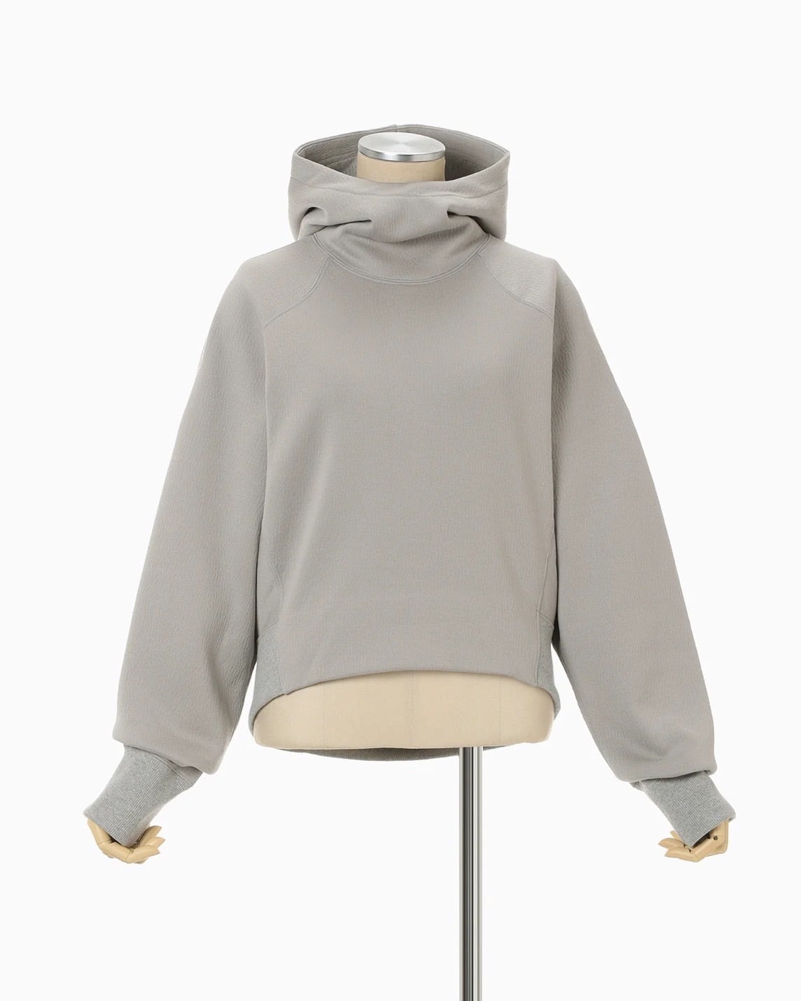 工場などで使用される表面に独特なシボ感のある不織布から、毛羽立ちの少ない独特な風合いを生地で表現。コンパクトな身頃と大きめに設計されたフード、立ち上がったネックのドレープが上品なアクセントに。ラグランスリーブから流れるように膨らむ裾のフォルムがリラックスムードを叶える1着。