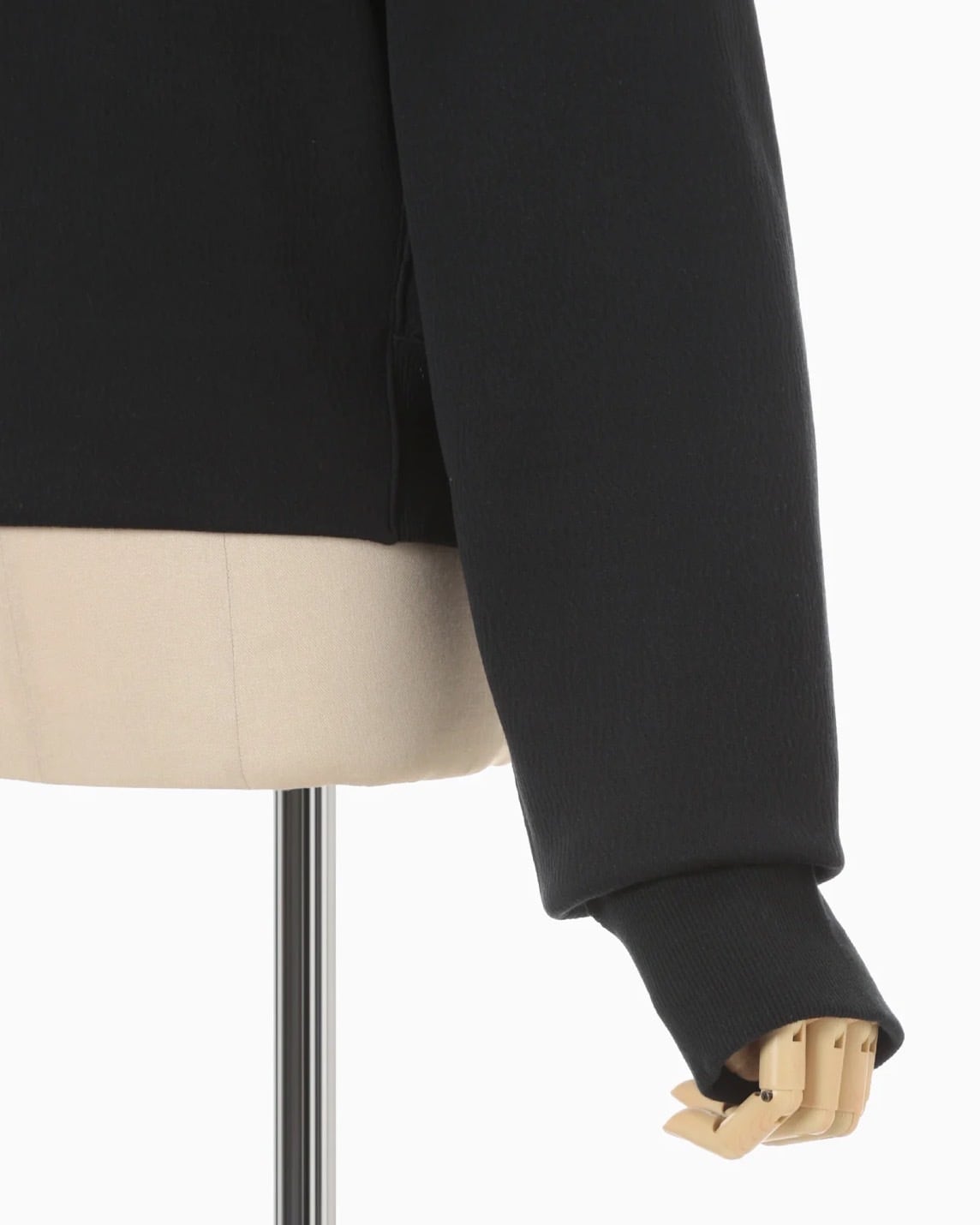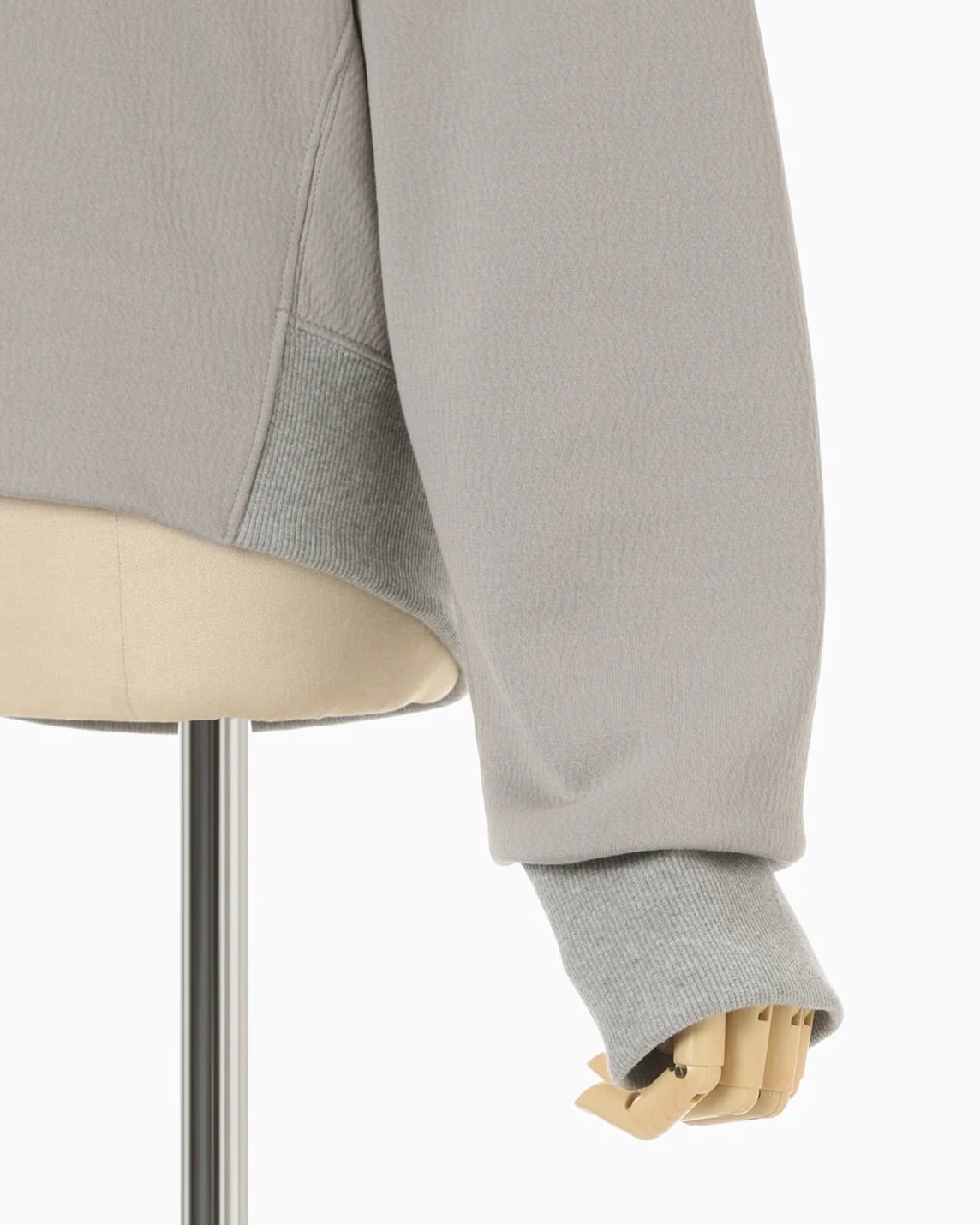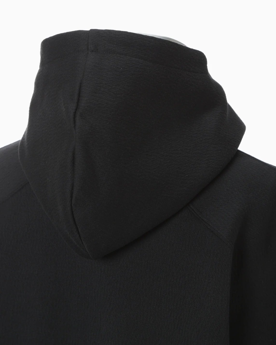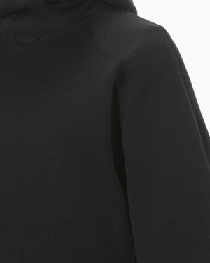 工場などで使用される表面に独特なシボ感のある不織布から、毛羽立ちの少ない独特な風合いを生地で表現。コンパクトな身頃と大きめに設計されたフード、立ち上がったネックのドレープが上品なアクセントに。ラグランスリーブから流れるように膨らむ裾のフォルムがリラックスムードを叶える1着。