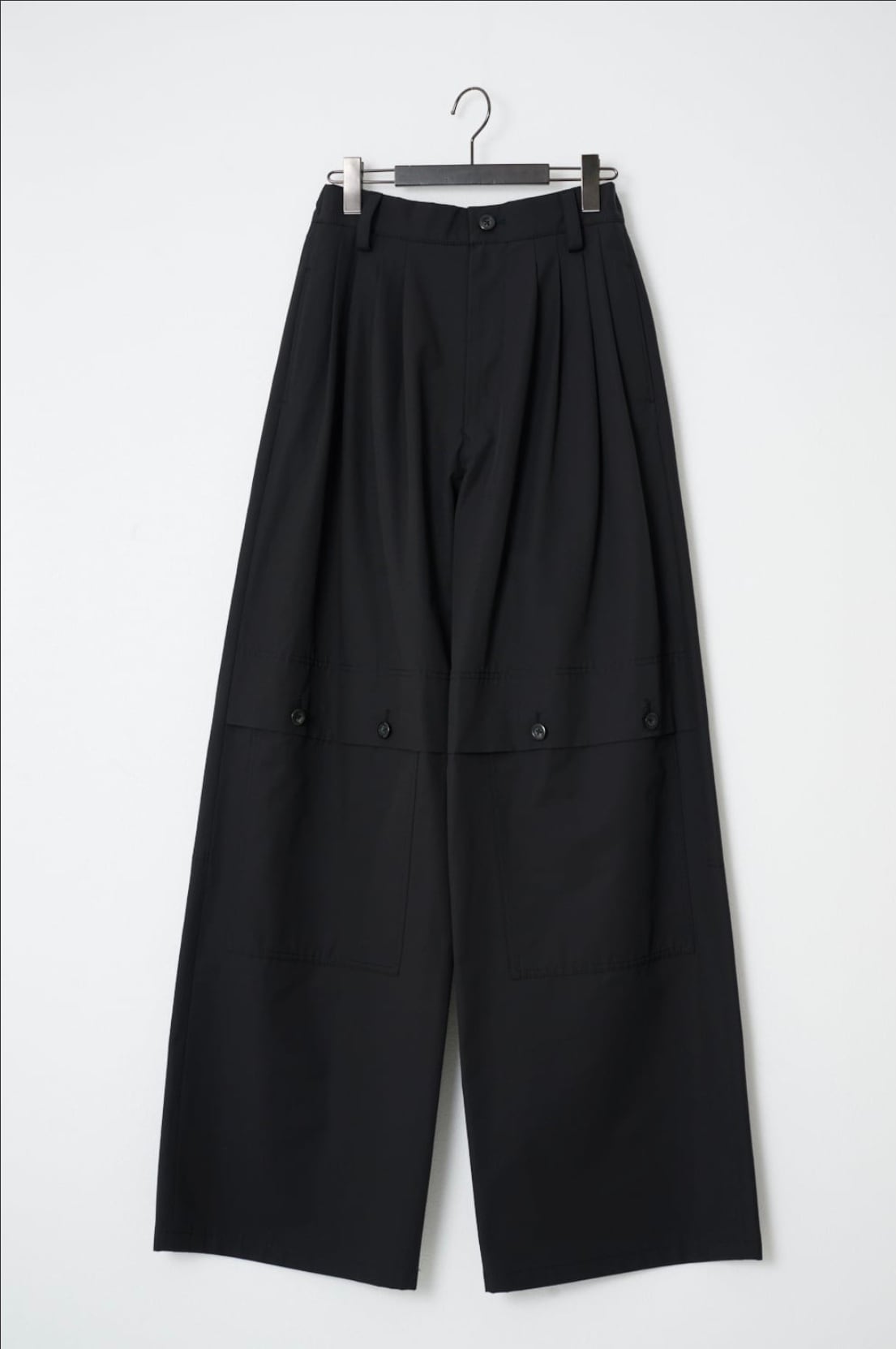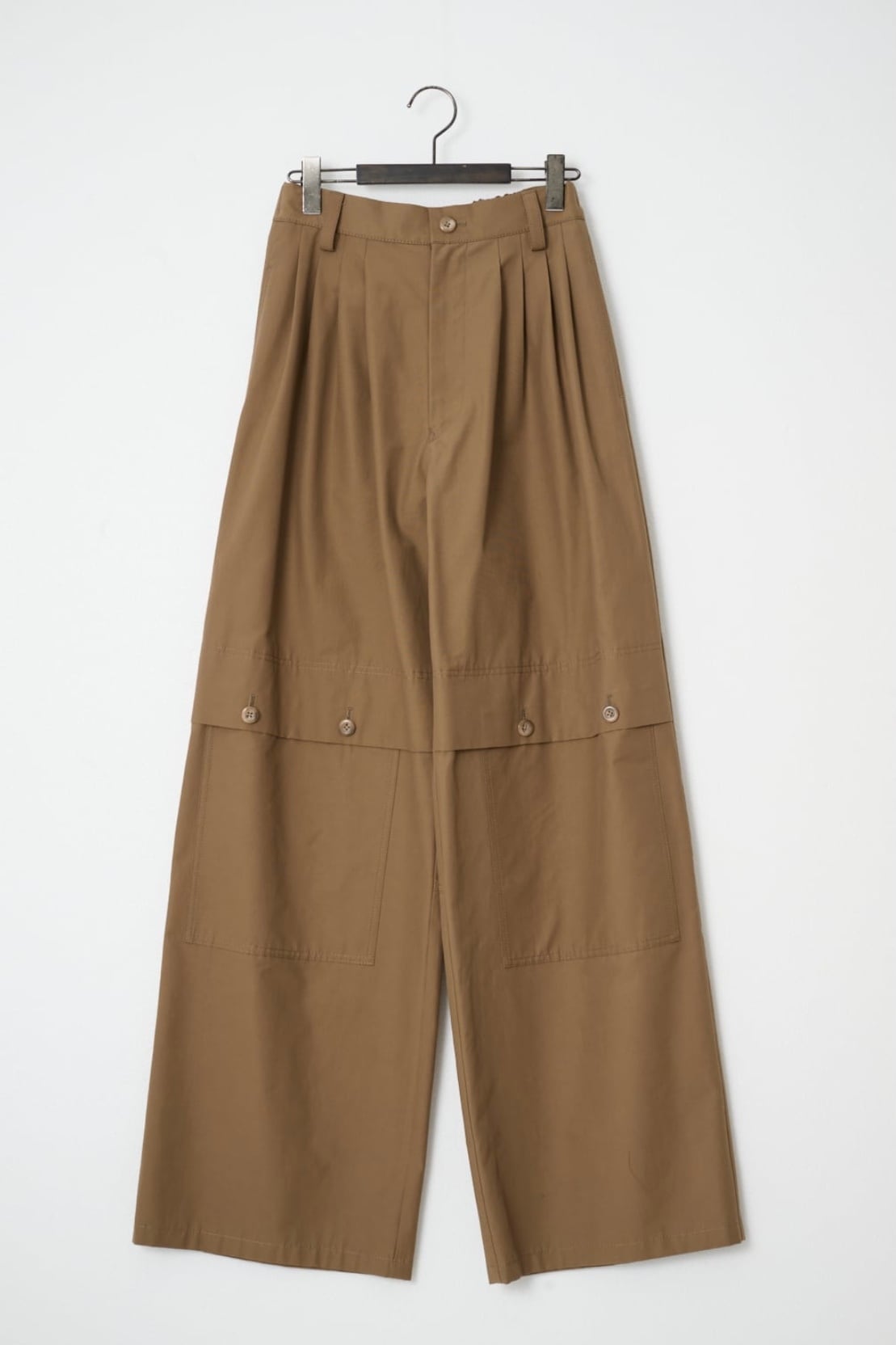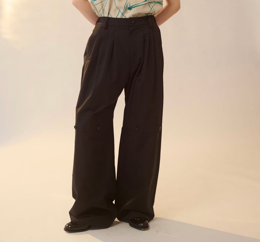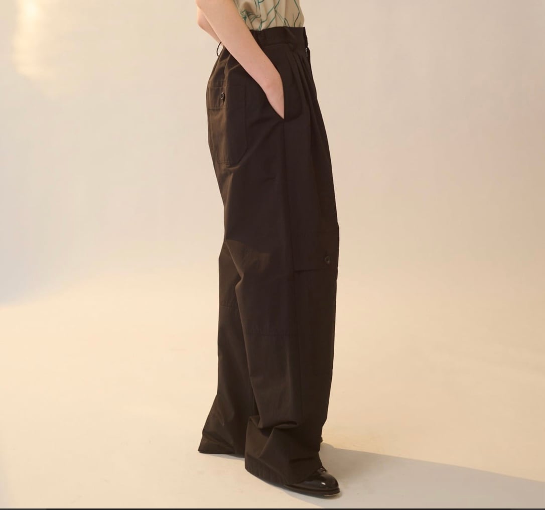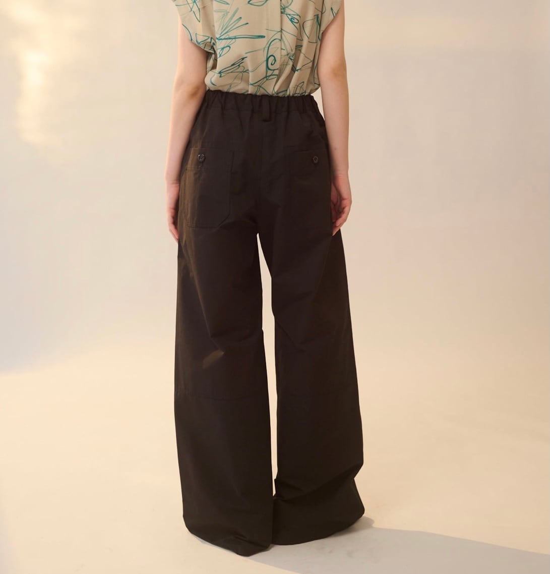 ワークテイストなディテールが特徴のパンツです。フロントの⾝頃続きのフラップやアウトポケット、ステッチなどがアクセントになっています。後ろはゴム仕様でストレスフリーな履き⼼地です。