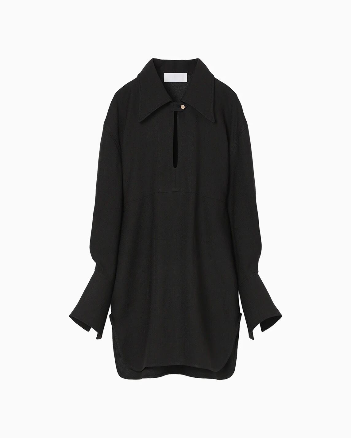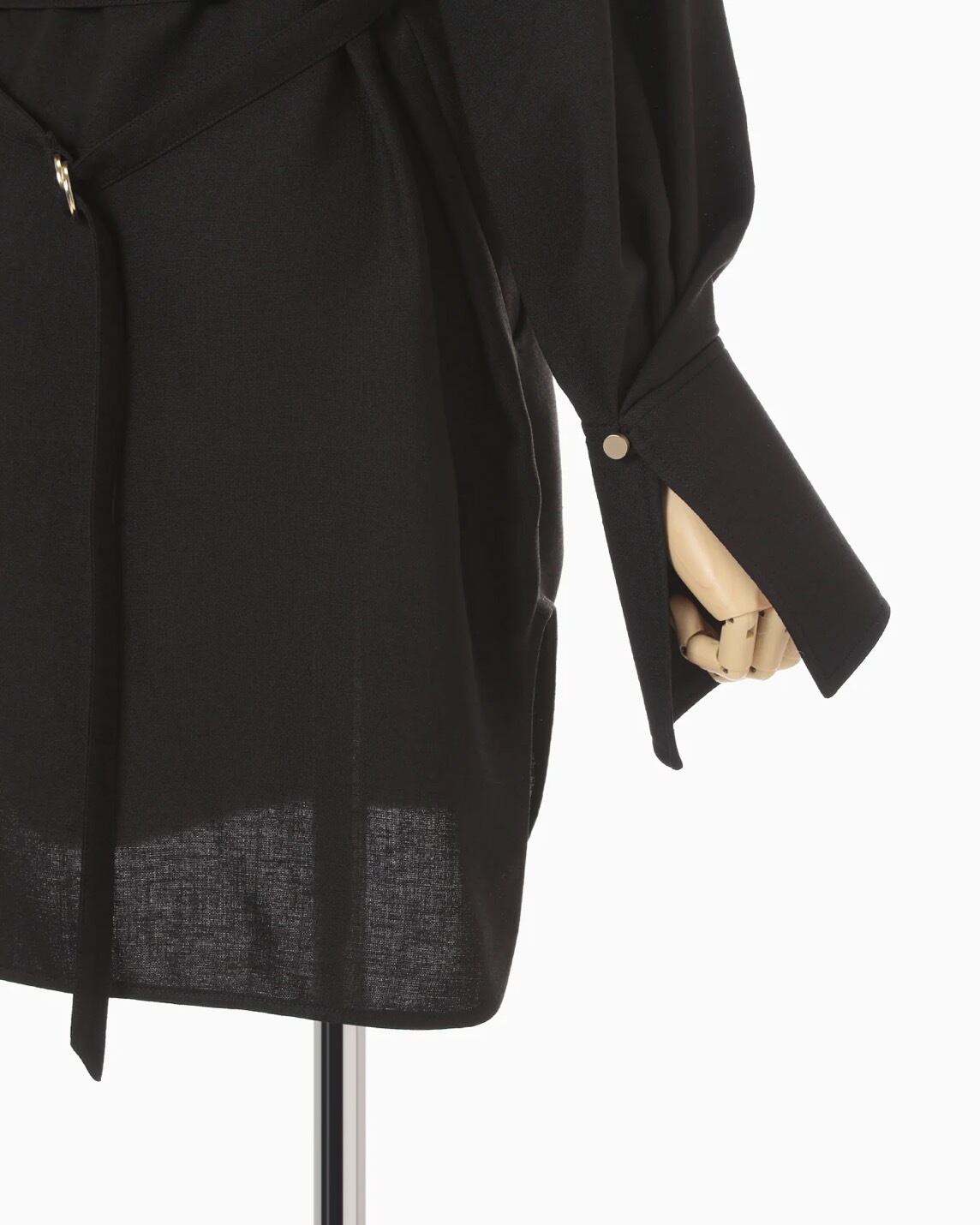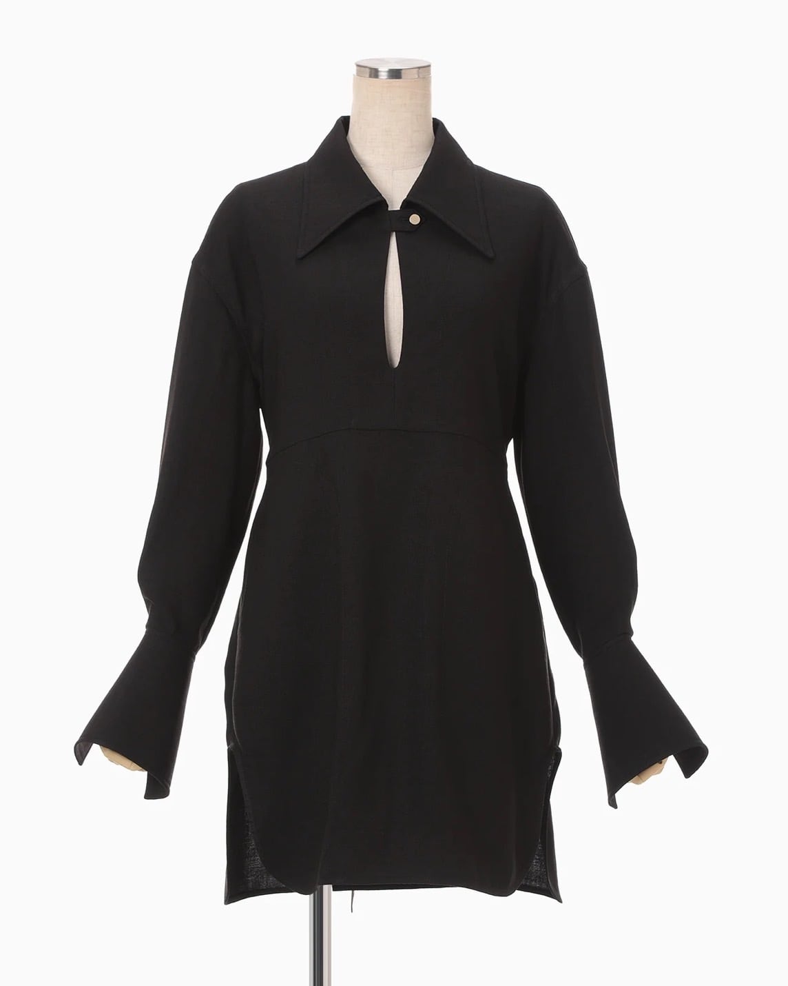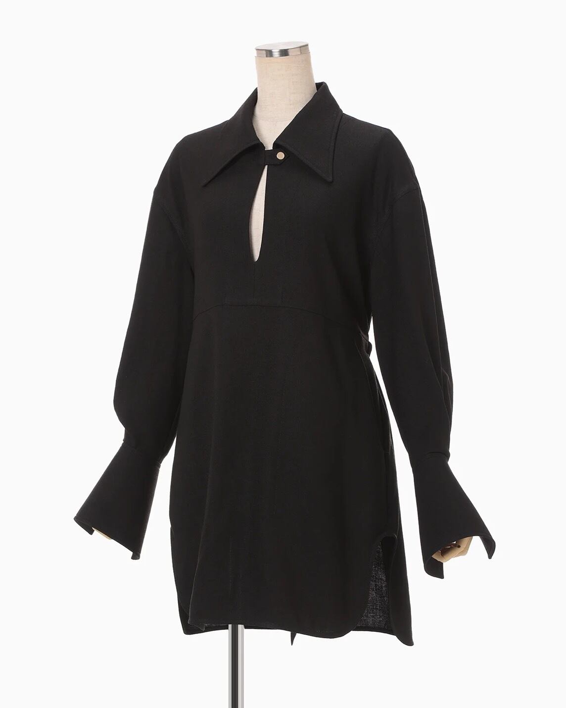 麻の風合いを表現したトリアセテート素材はそれぞれの素材が持つ特性を生かし、軽やかでシワになりにくく、麻のようなドライタッチを実現。大きめの襟と大胆に開いた胸元のスリットのバランスがユニーク。腰まわりを優しくカバーするチュニック丈が汎用性に優れた1着。