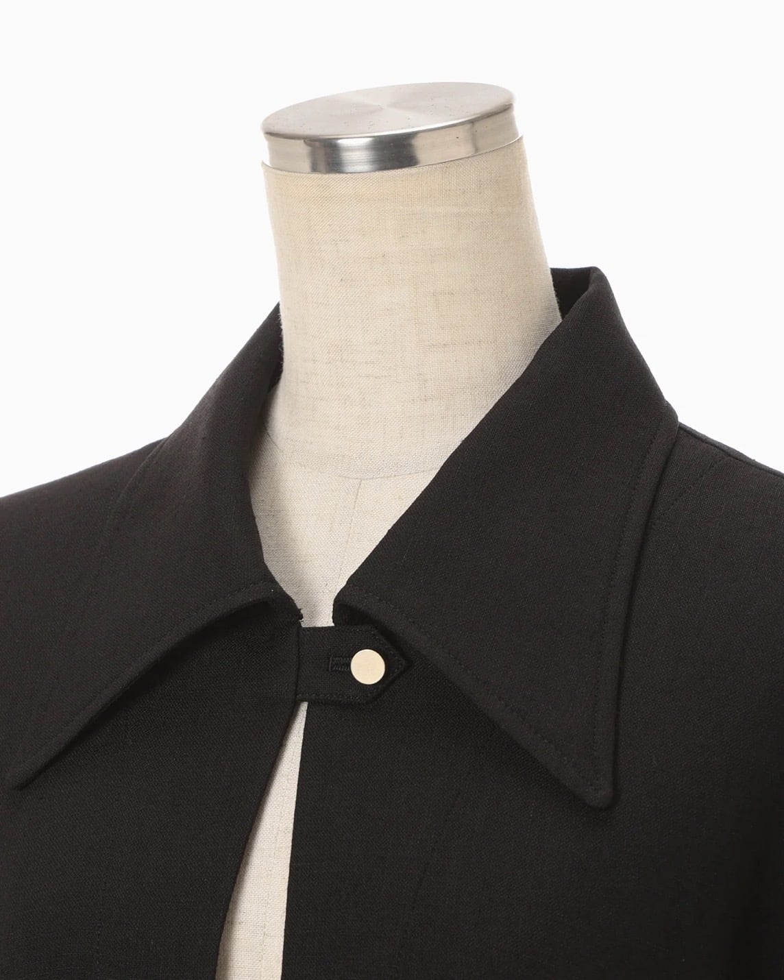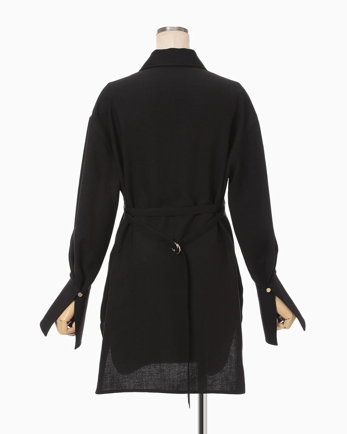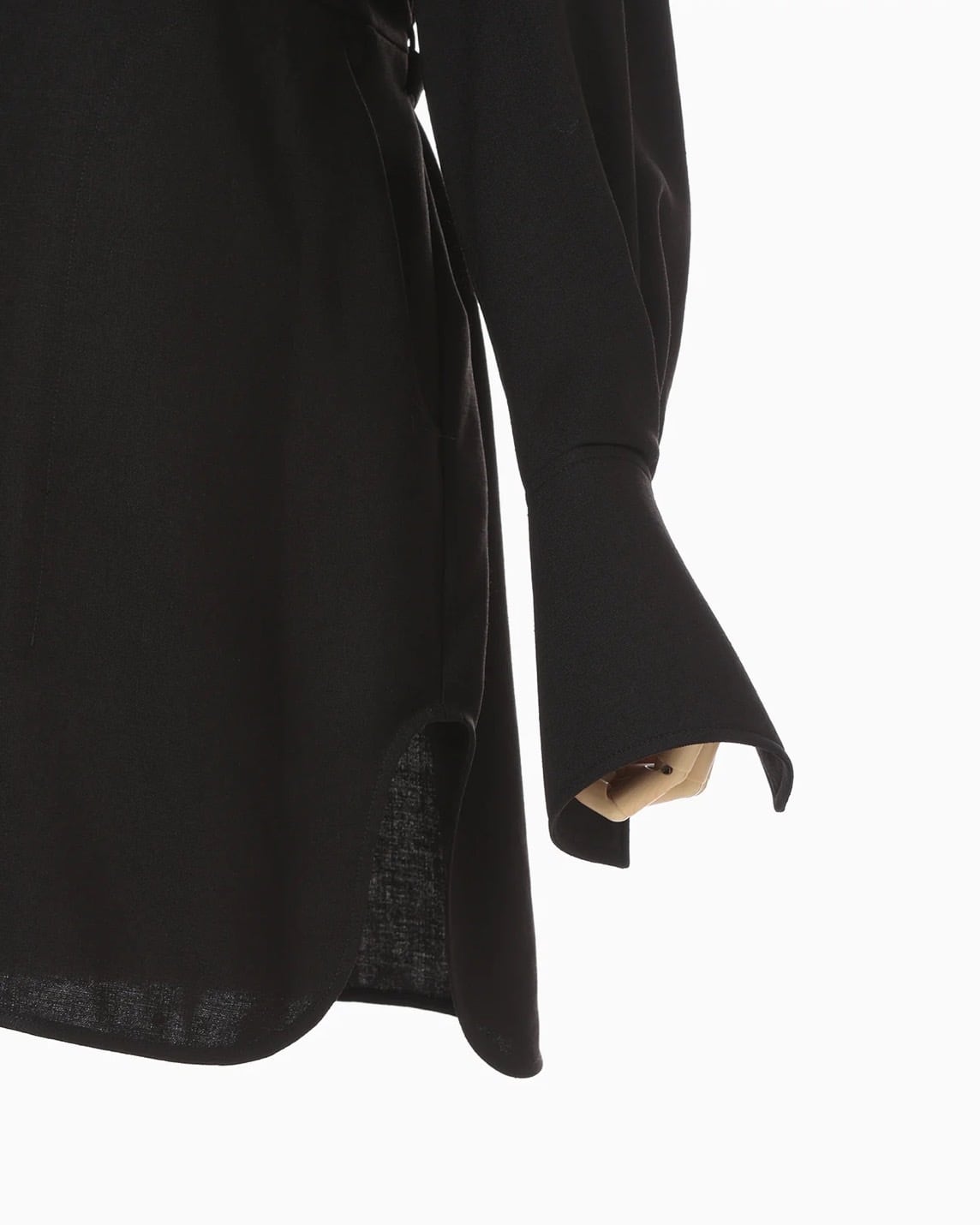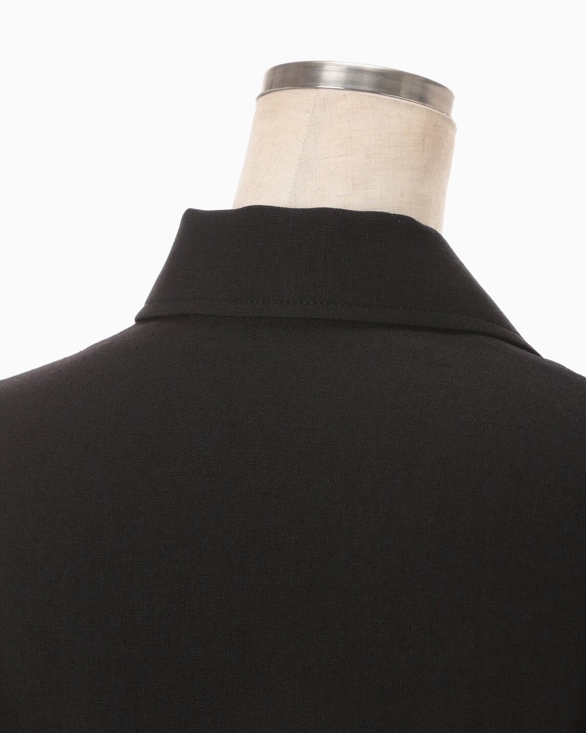 麻の風合いを表現したトリアセテート素材はそれぞれの素材が持つ特性を生かし、軽やかでシワになりにくく、麻のようなドライタッチを実現。大きめの襟と大胆に開いた胸元のスリットのバランスがユニーク。腰まわりを優しくカバーするチュニック丈が汎用性に優れた1着。