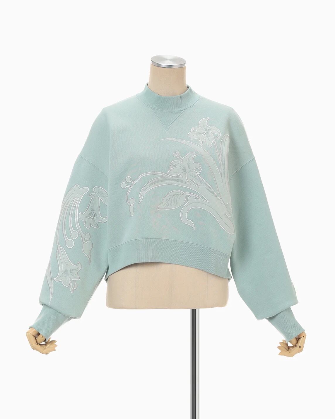 可憐な草花の刺繍を大胆に施したジャージーショート丈トップ。