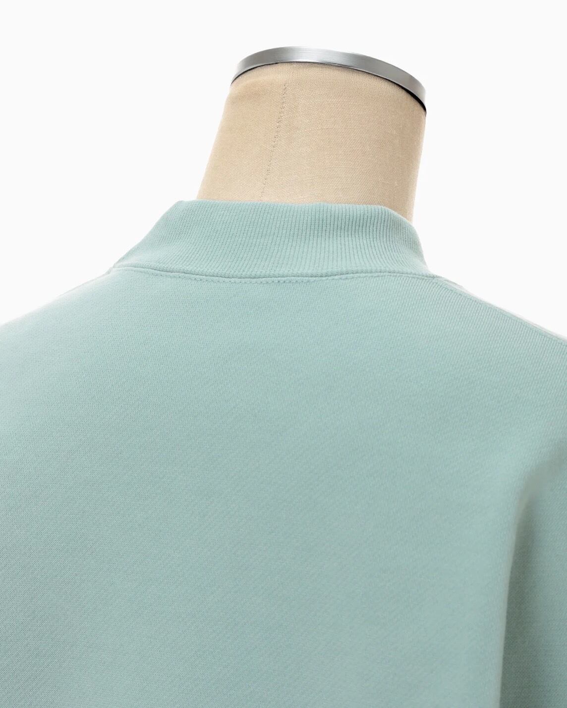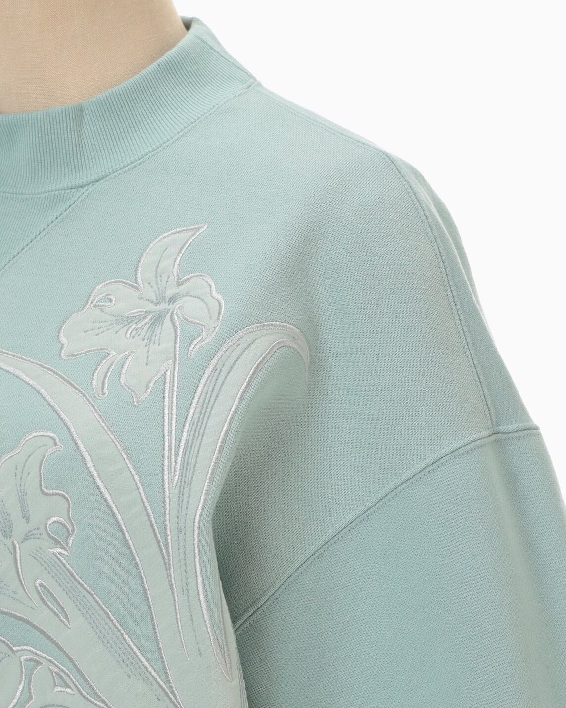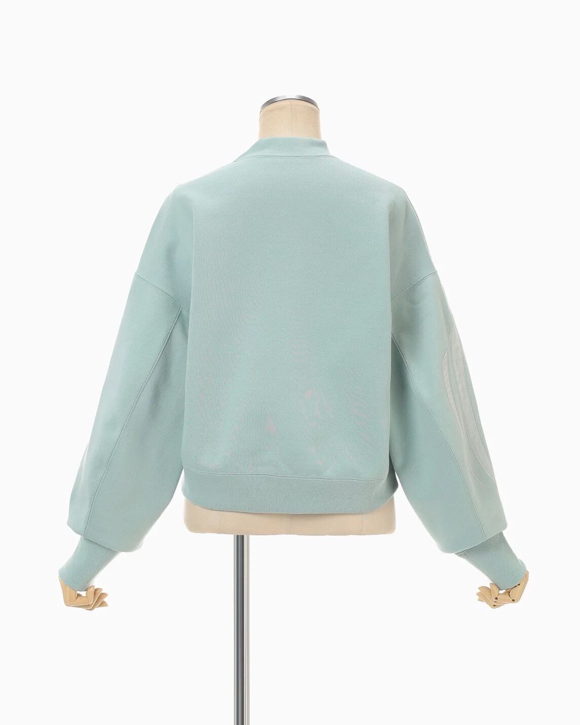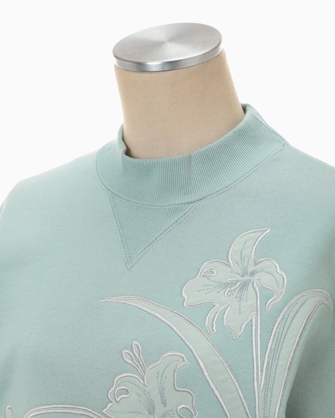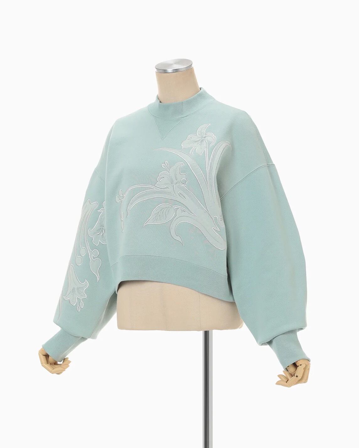 肉厚なジャージー素材はハリ感のあるしっかりとした生地にシルケット加工を施すことで光沢感のある上品な仕上がりに。花柄にカットしたオーガンジーの縁を刺繍で縫い留めたアップリケ刺繍が、カジュアルさの中に繊細な気品を付与し、短い設定の着丈がボトムスとのバランスも取り易く、リラクシングかつ汎用性にも優れる。同素材のスカートとセットアップ着用が可能。