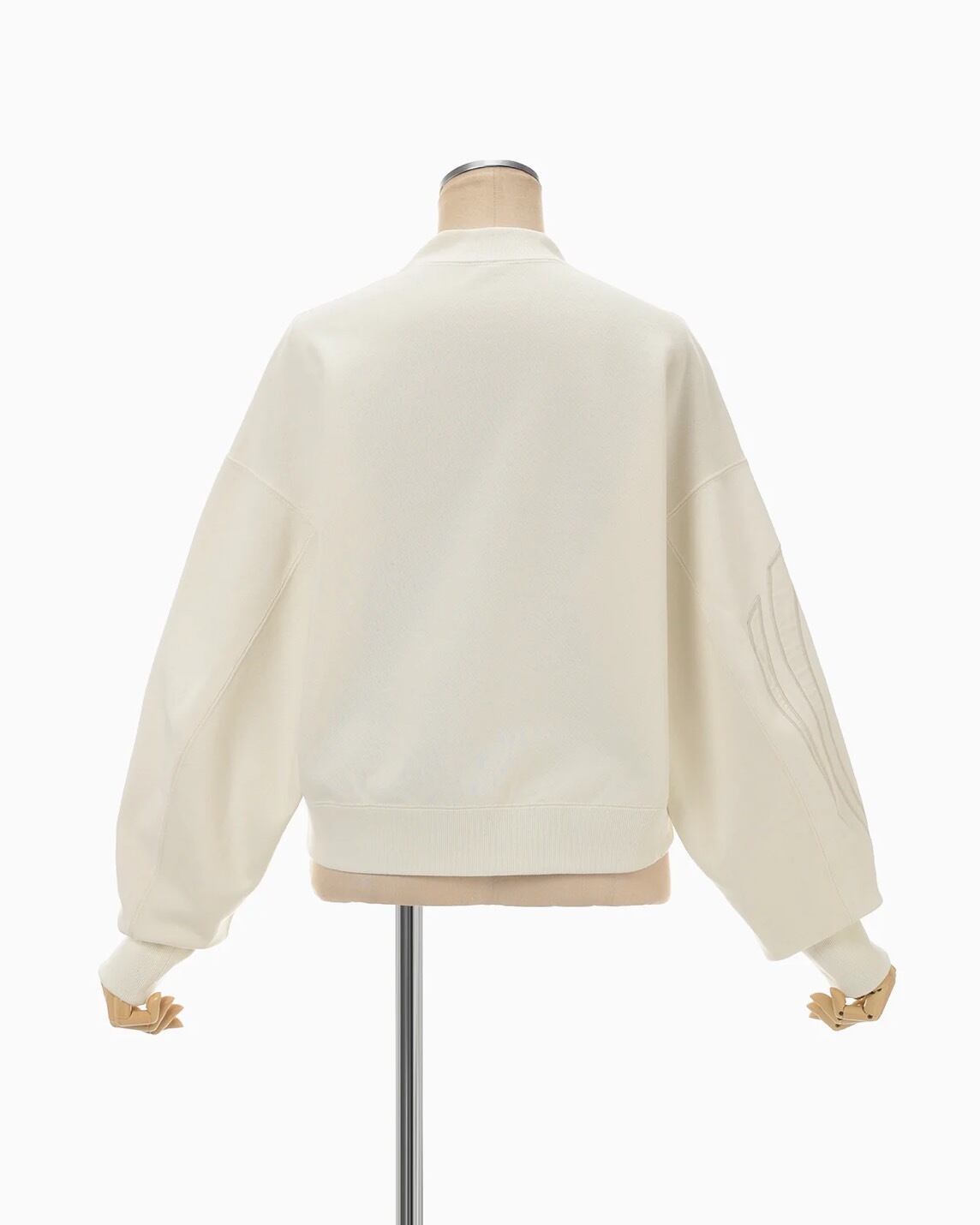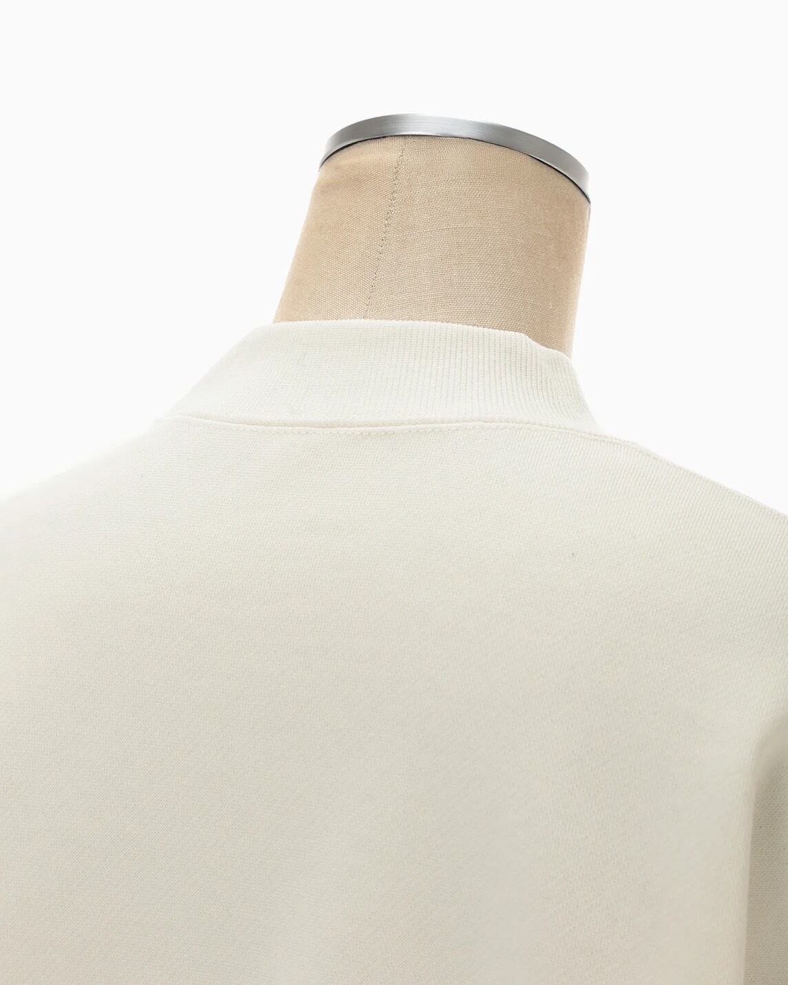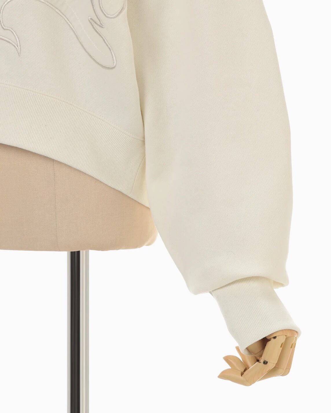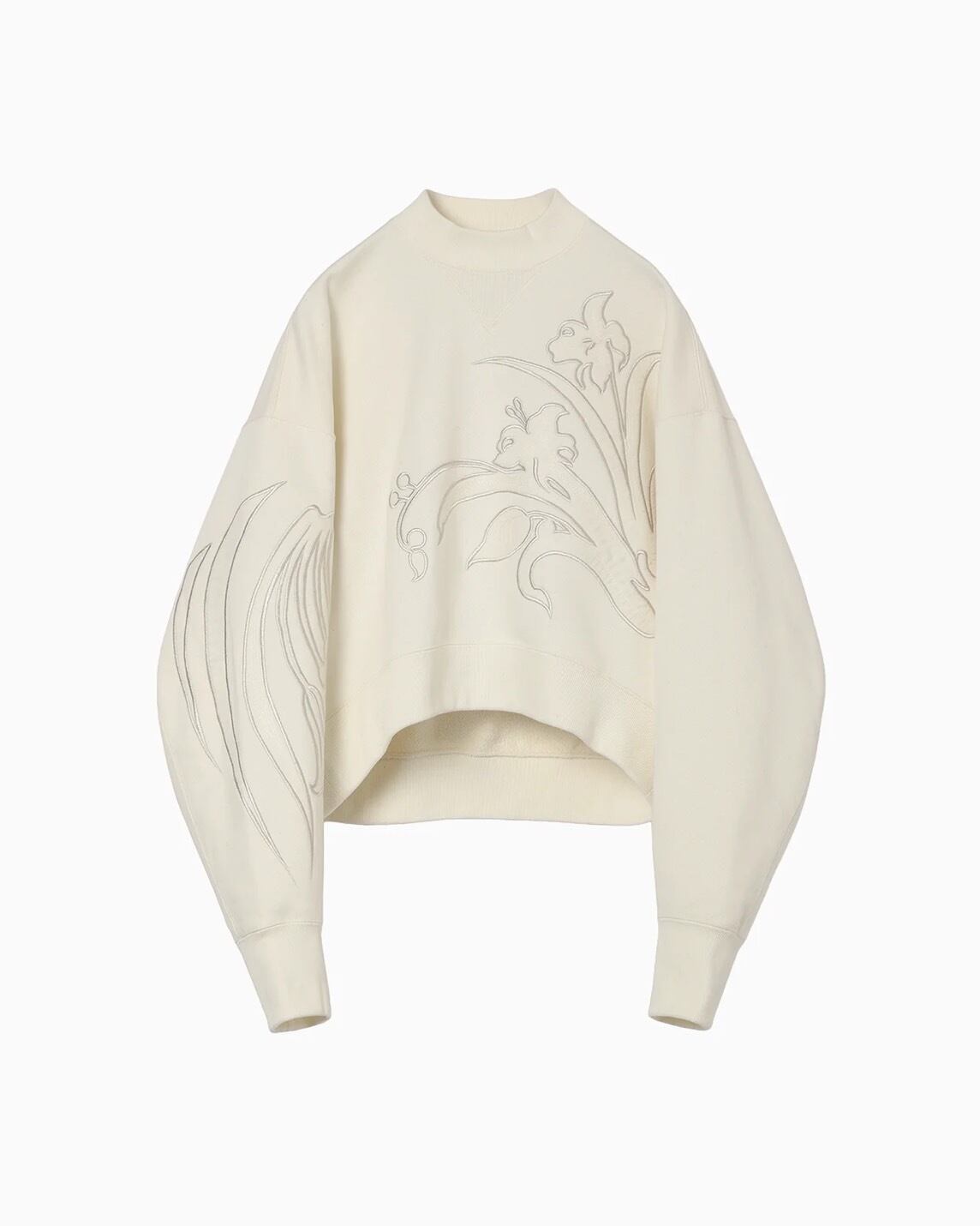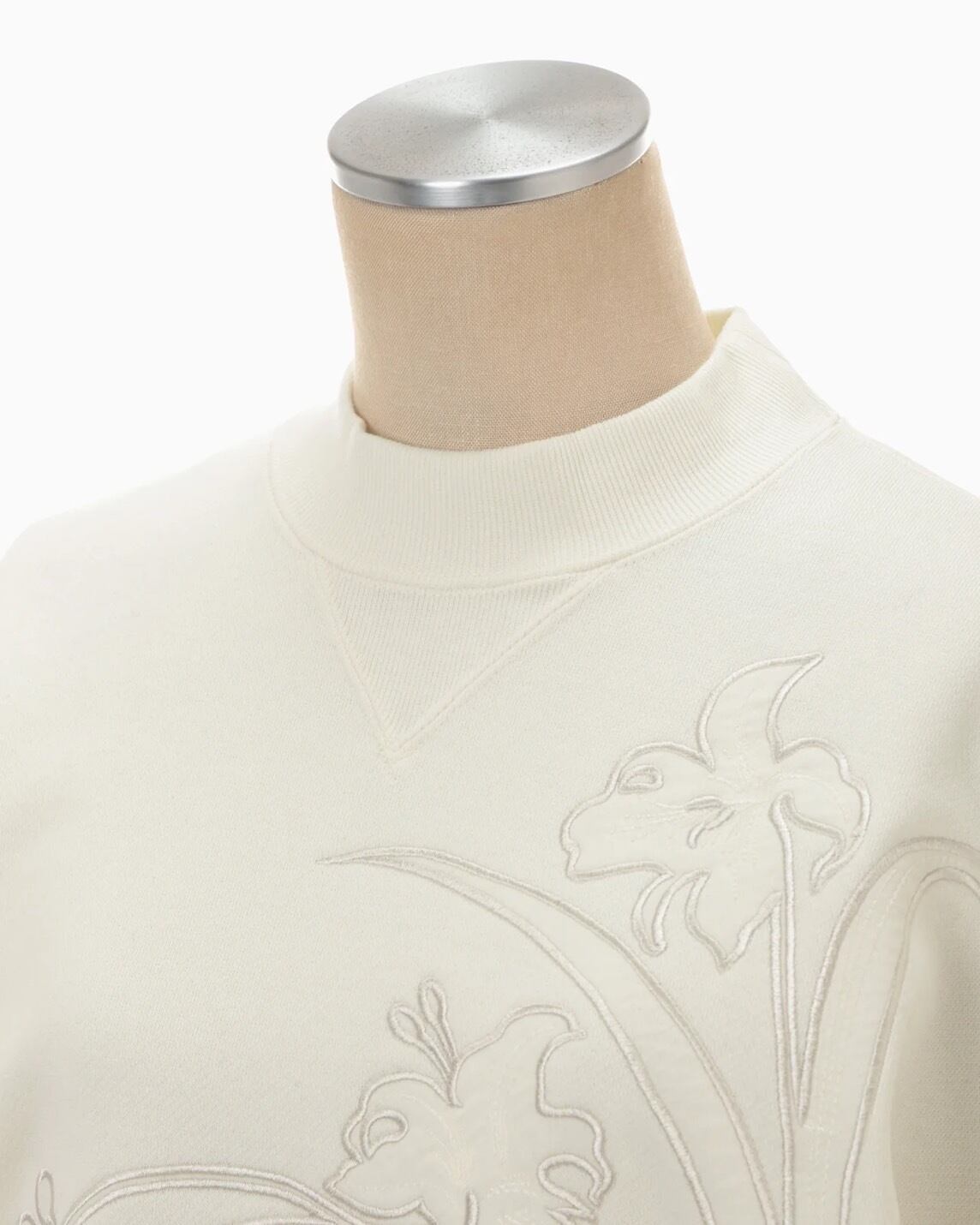 肉厚なジャージー素材はハリ感のあるしっかりとした生地にシルケット加工を施すことで光沢感のある上品な仕上がりに。花柄にカットしたオーガンジーの縁を刺繍で縫い留めたアップリケ刺繍が、カジュアルさの中に繊細な気品を付与し、短い設定の着丈がボトムスとのバランスも取り易く、リラクシングかつ汎用性にも優れる。同素材のスカートとセットアップ着用が可能。