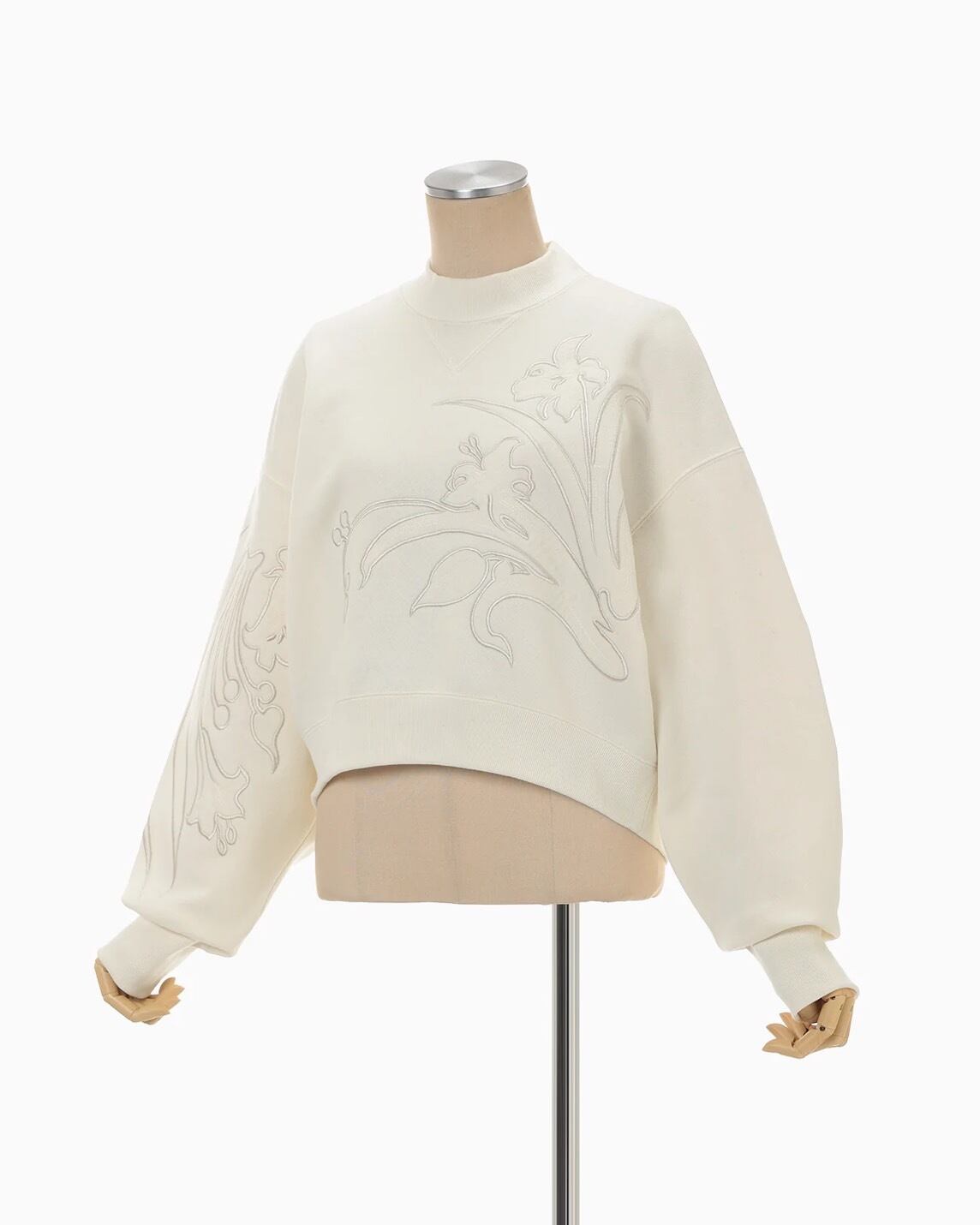 可憐な草花の刺繍を大胆に施したジャージーショート丈トップ。