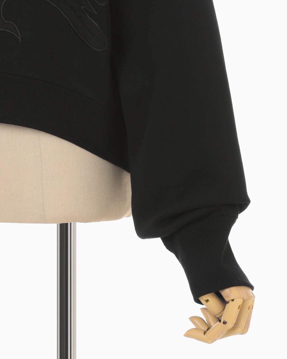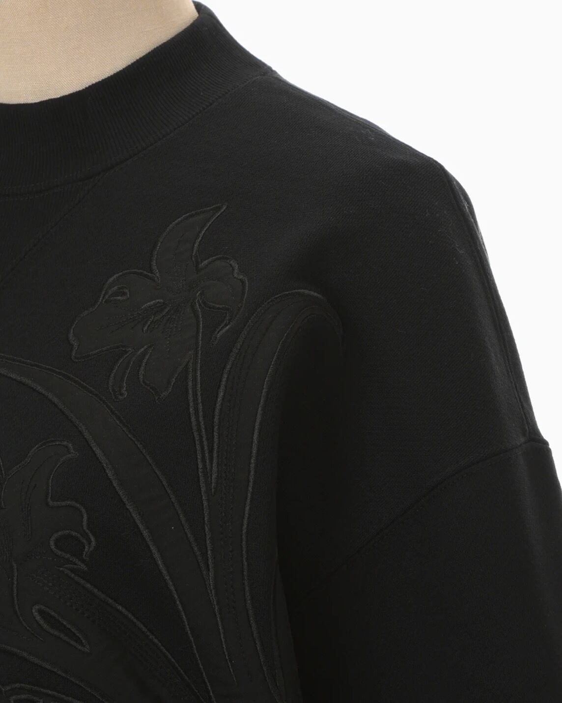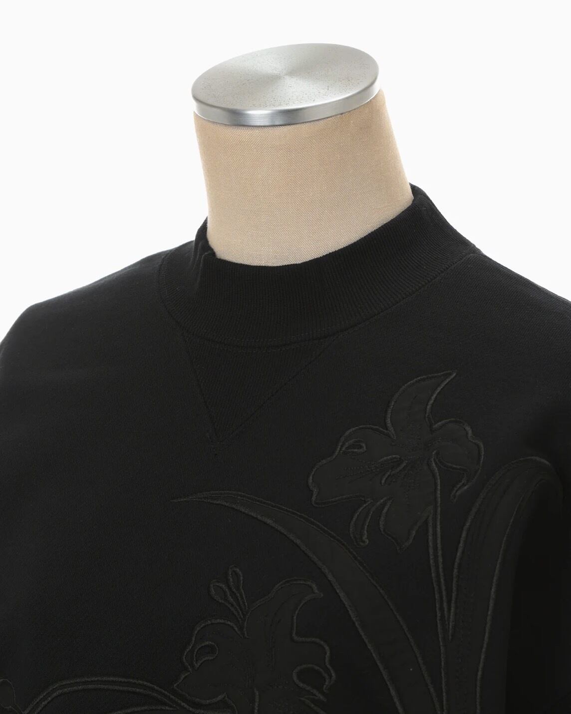 肉厚なジャージー素材はハリ感のあるしっかりとした生地にシルケット加工を施すことで光沢感のある上品な仕上がりに。花柄にカットしたオーガンジーの縁を刺繍で縫い留めたアップリケ刺繍が、カジュアルさの中に繊細な気品を付与し、短い設定の着丈がボトムスとのバランスも取り易く、リラクシングかつ汎用性にも優れる。同素材のスカートとセットアップ着用が可能。