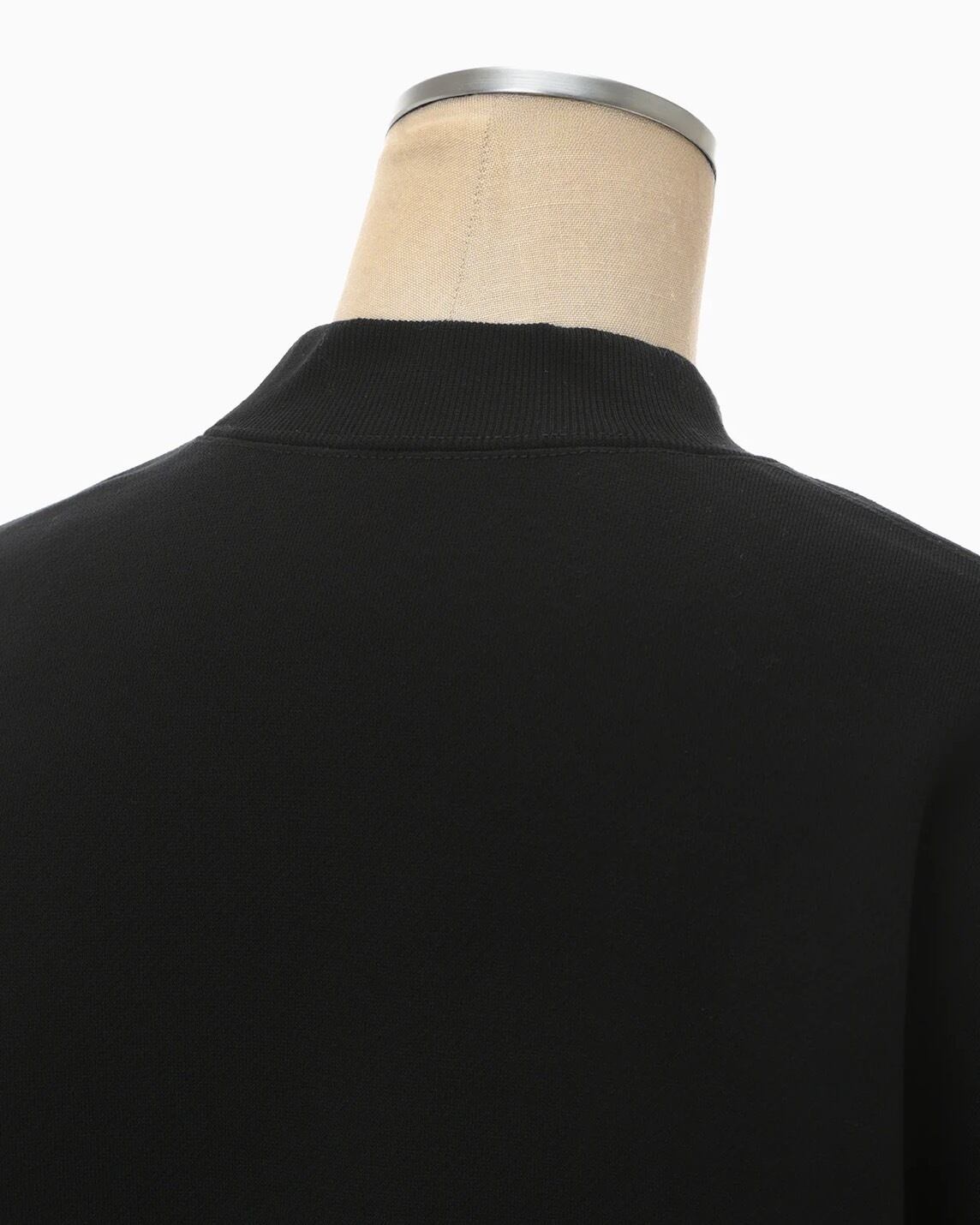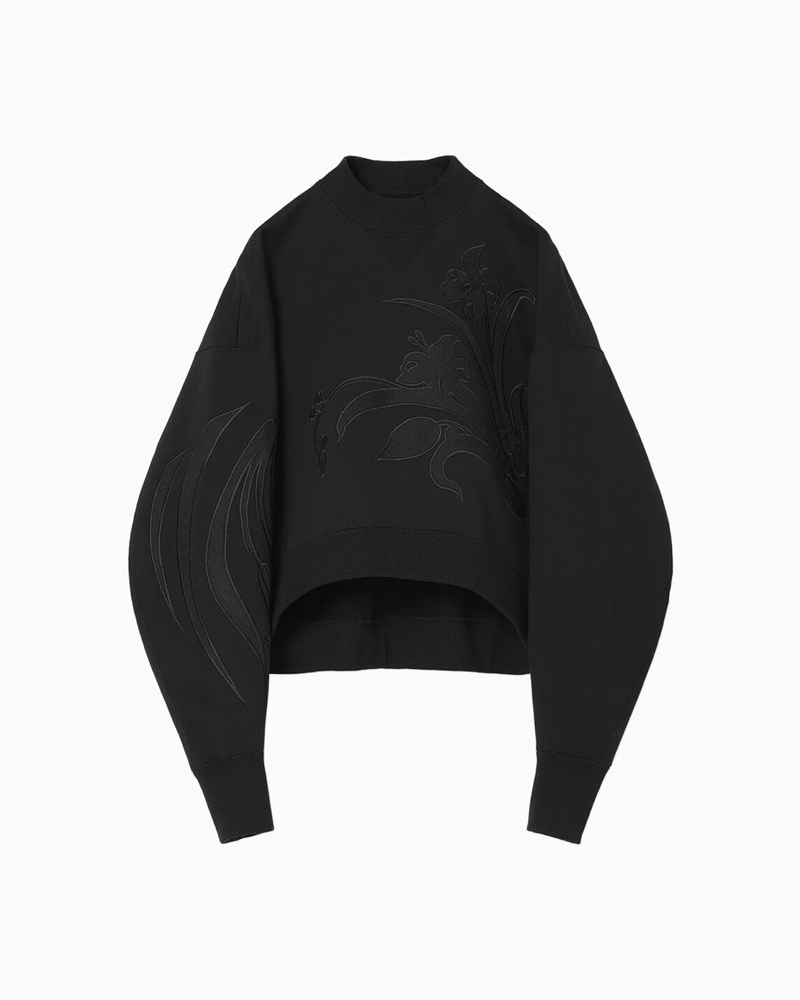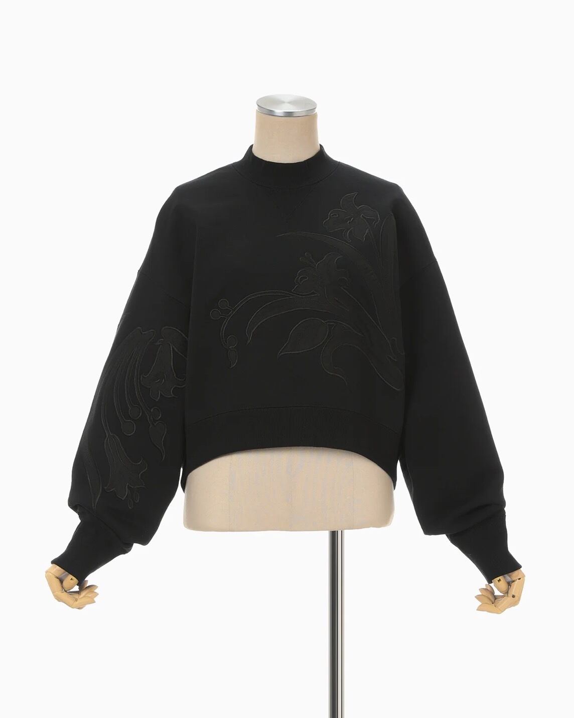肉厚なジャージー素材はハリ感のあるしっかりとした生地にシルケット加工を施すことで光沢感のある上品な仕上がりに。花柄にカットしたオーガンジーの縁を刺繍で縫い留めたアップリケ刺繍が、カジュアルさの中に繊細な気品を付与し、短い設定の着丈がボトムスとのバランスも取り易く、リラクシングかつ汎用性にも優れる。同素材のスカートとセットアップ着用が可能。