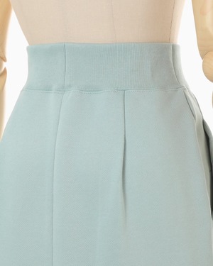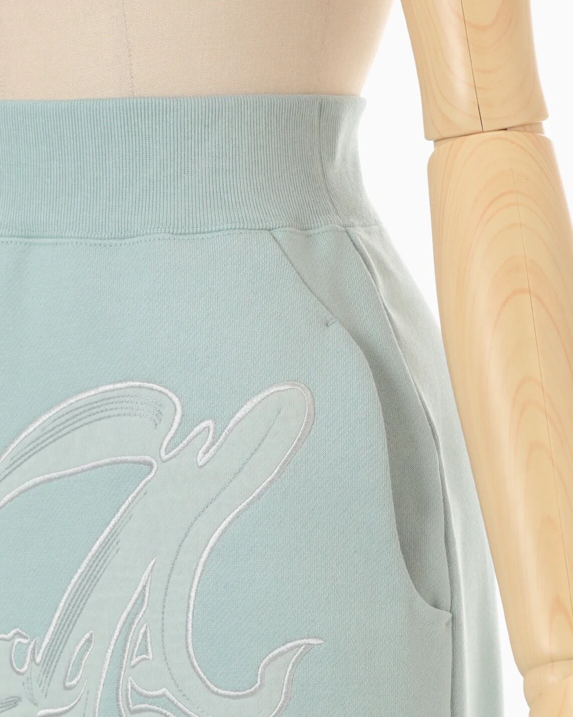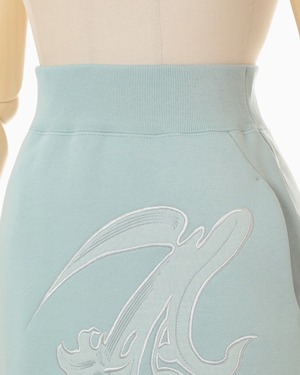 肉厚なジャージー素材はハリ感のあるしっかりとした生地にシルケット加工を施すことで光沢感のある上品な仕上がりに。花柄にカットしたオーガンジーの縁を刺繍で縫い留めたアップリケ刺繍が、カジュアルさの中に繊細な気品を付与し、ハイウエストのデザインが様々なトップスとのバランスの良いコーディネートを叶える。同素材のトップスとセットアップ着用も可能。