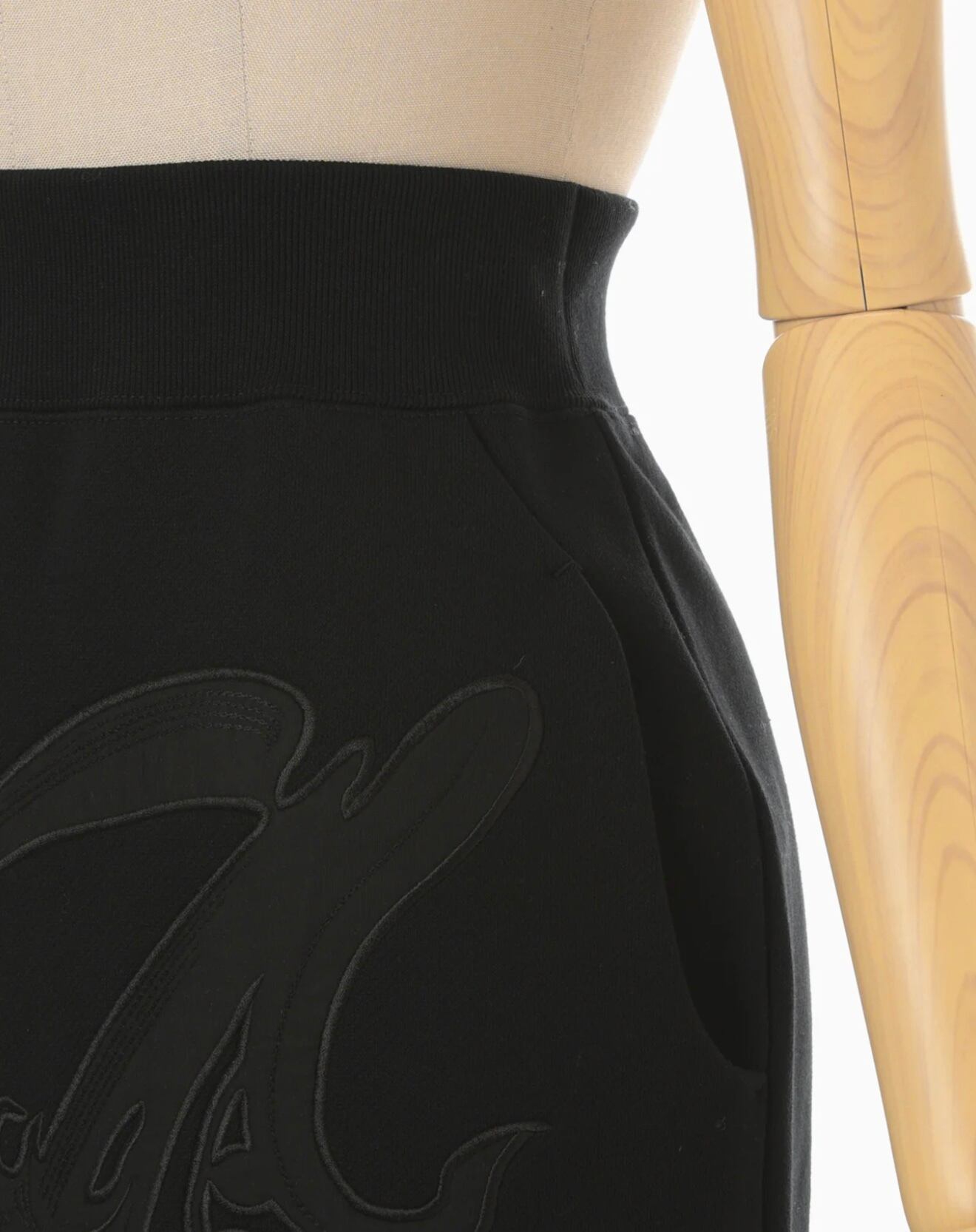 肉厚なジャージー素材はハリ感のあるしっかりとした生地にシルケット加工を施すことで光沢感のある上品な仕上がりに。花柄にカットしたオーガンジーの縁を刺繍で縫い留めたアップリケ刺繍が、カジュアルさの中に繊細な気品を付与し、ハイウエストのデザインが様々なトップスとのバランスの良いコーディネートを叶える。同素材のトップスとセットアップ着用も可能。