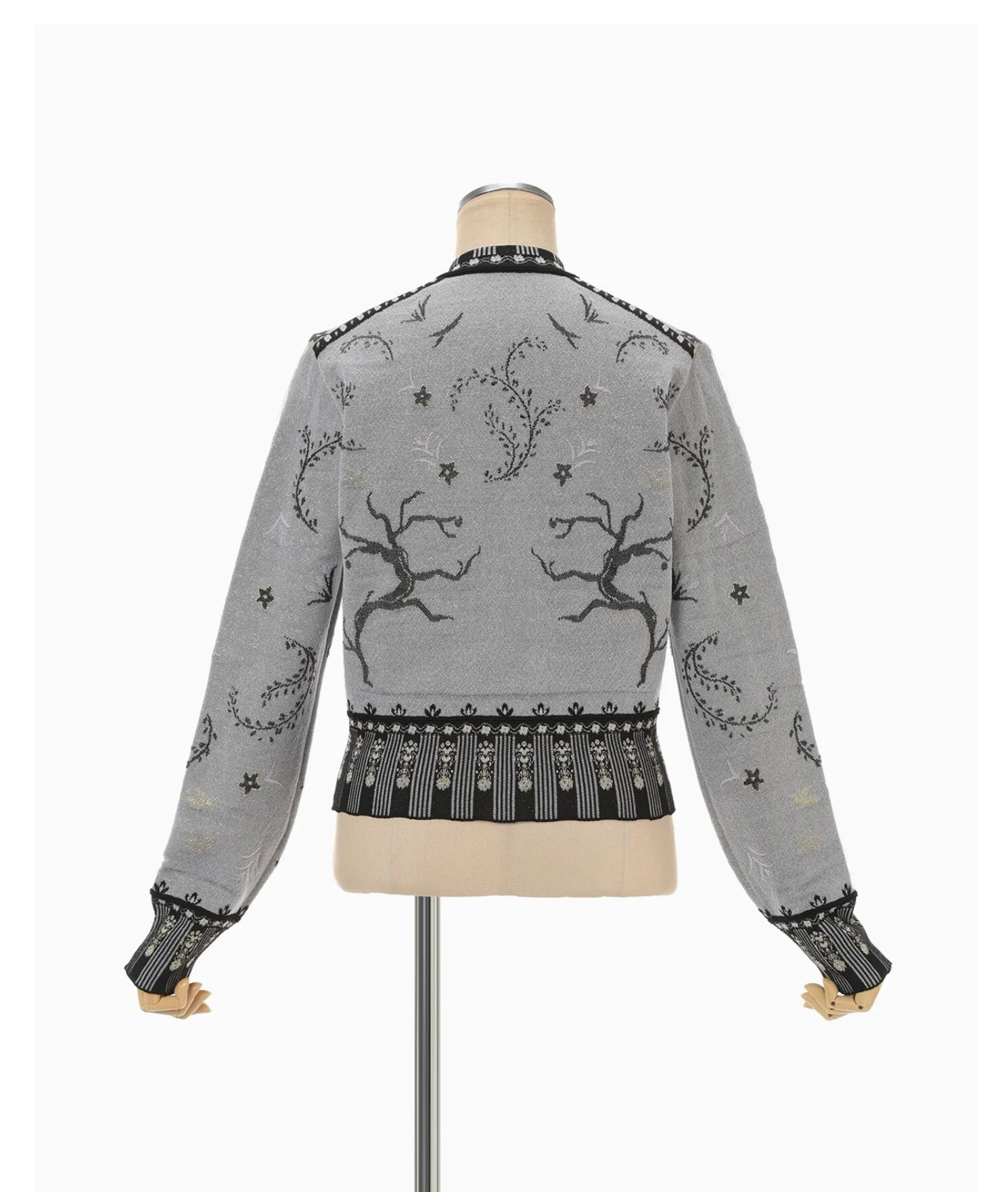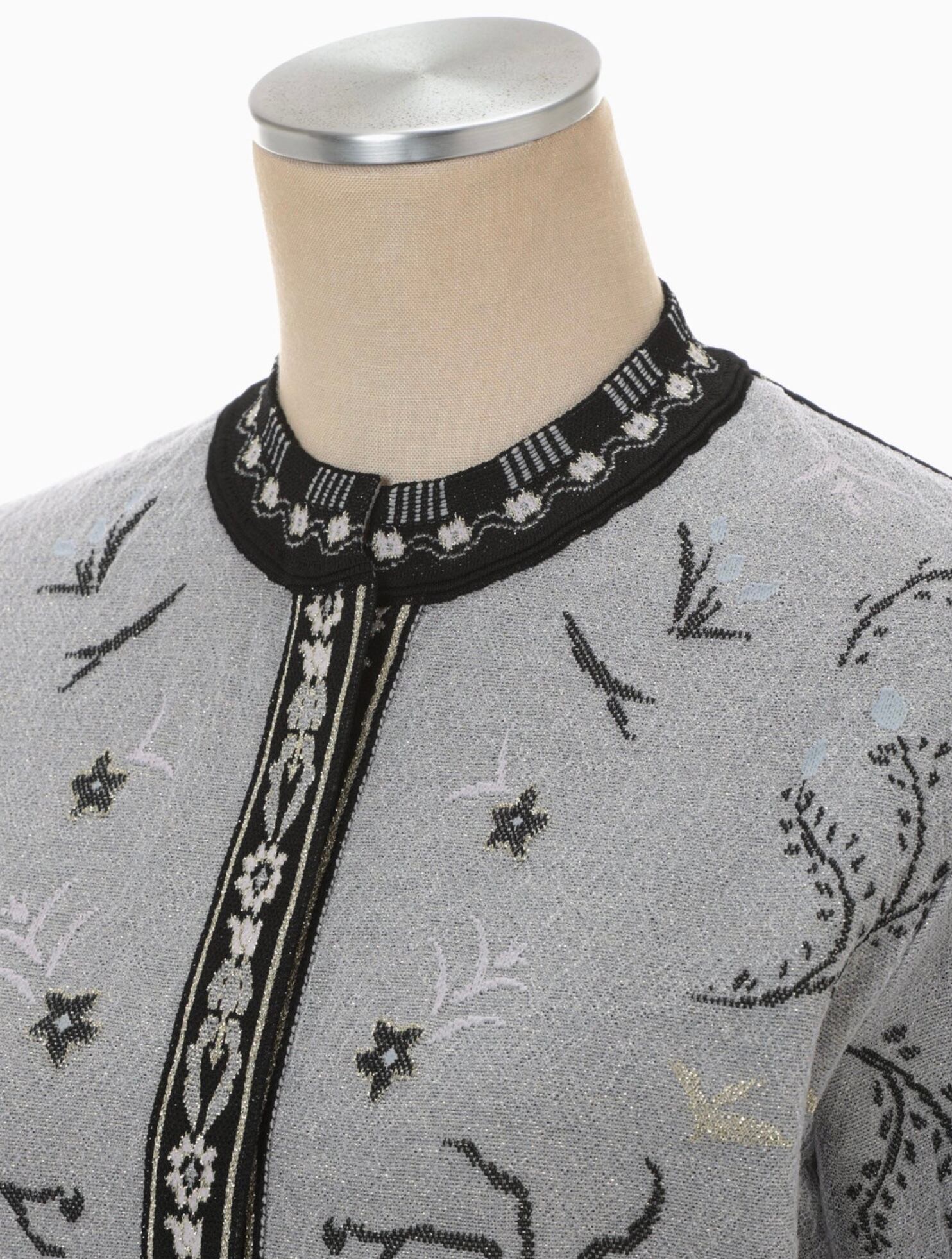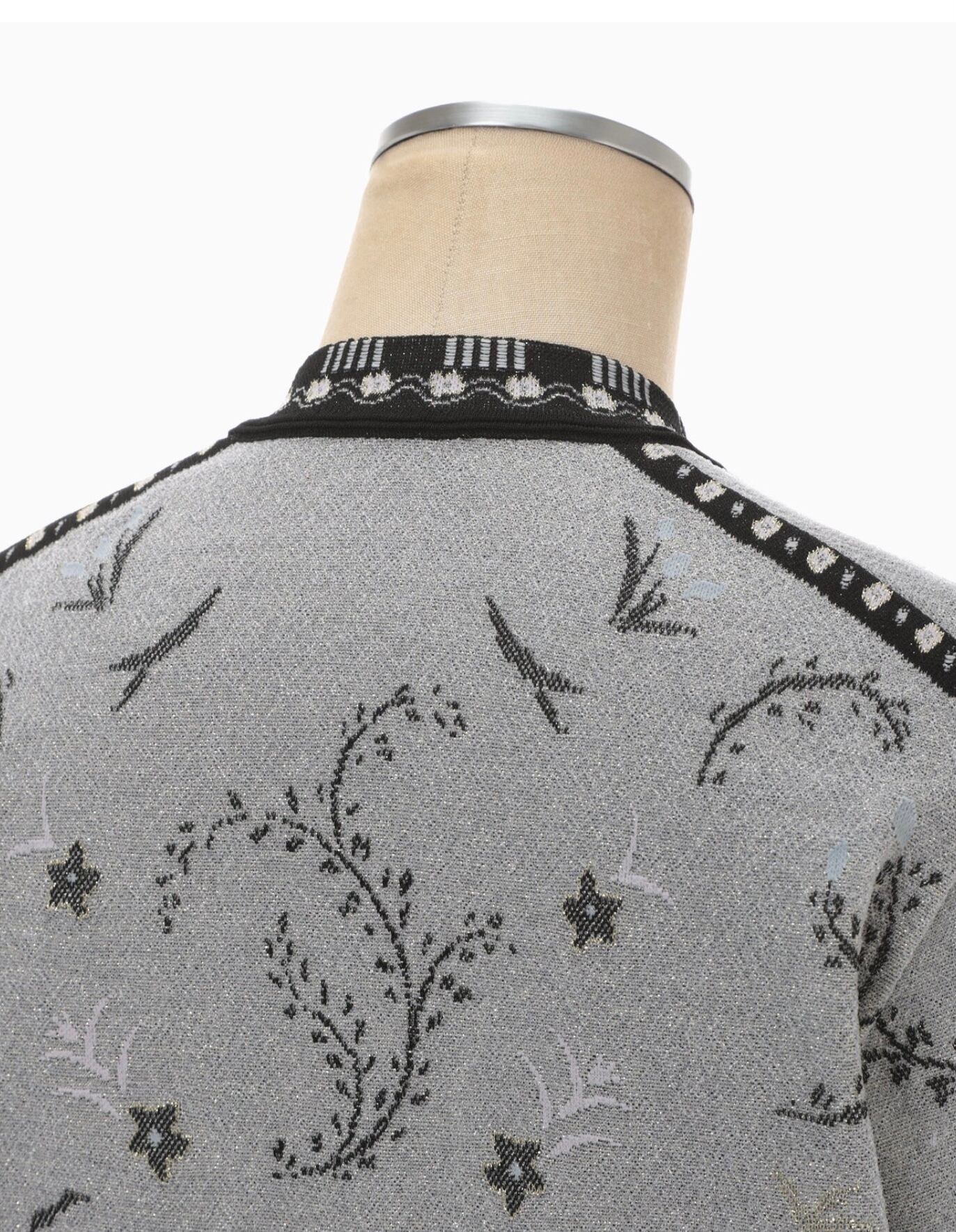 西洋のガラス工芸に見られる筆による絵付けの花柄をニットジャカードで再現。ラメ糸を用いた二重の編み地が奥行きのある表情を生み出す。コンパクトなサイジングが上品な印象を与え、細やかなディテールが随所に散りばめられた1着。