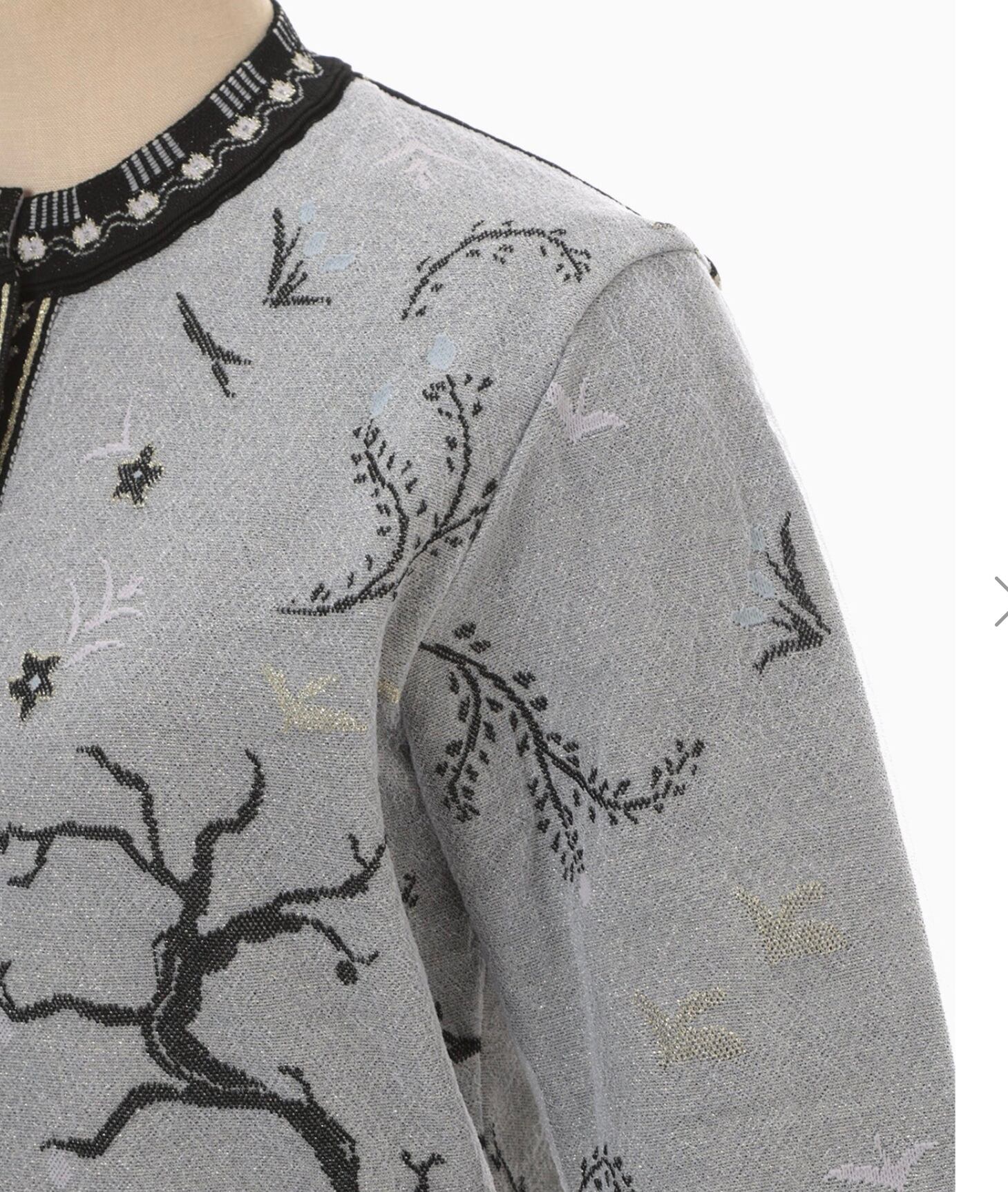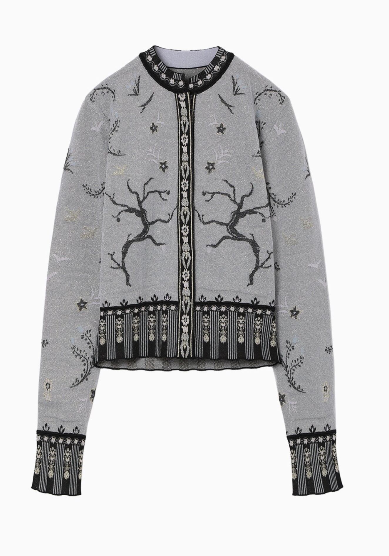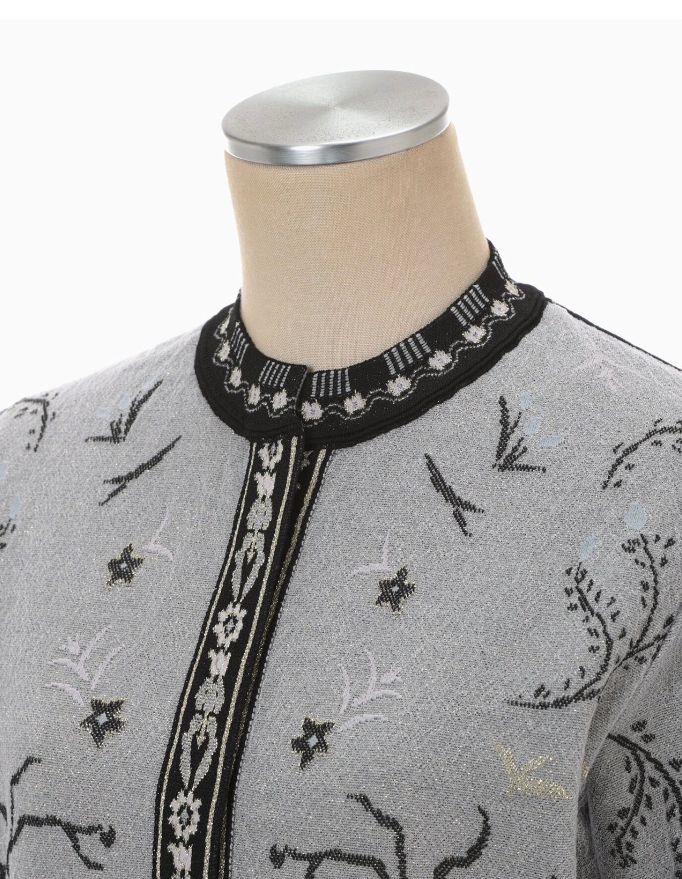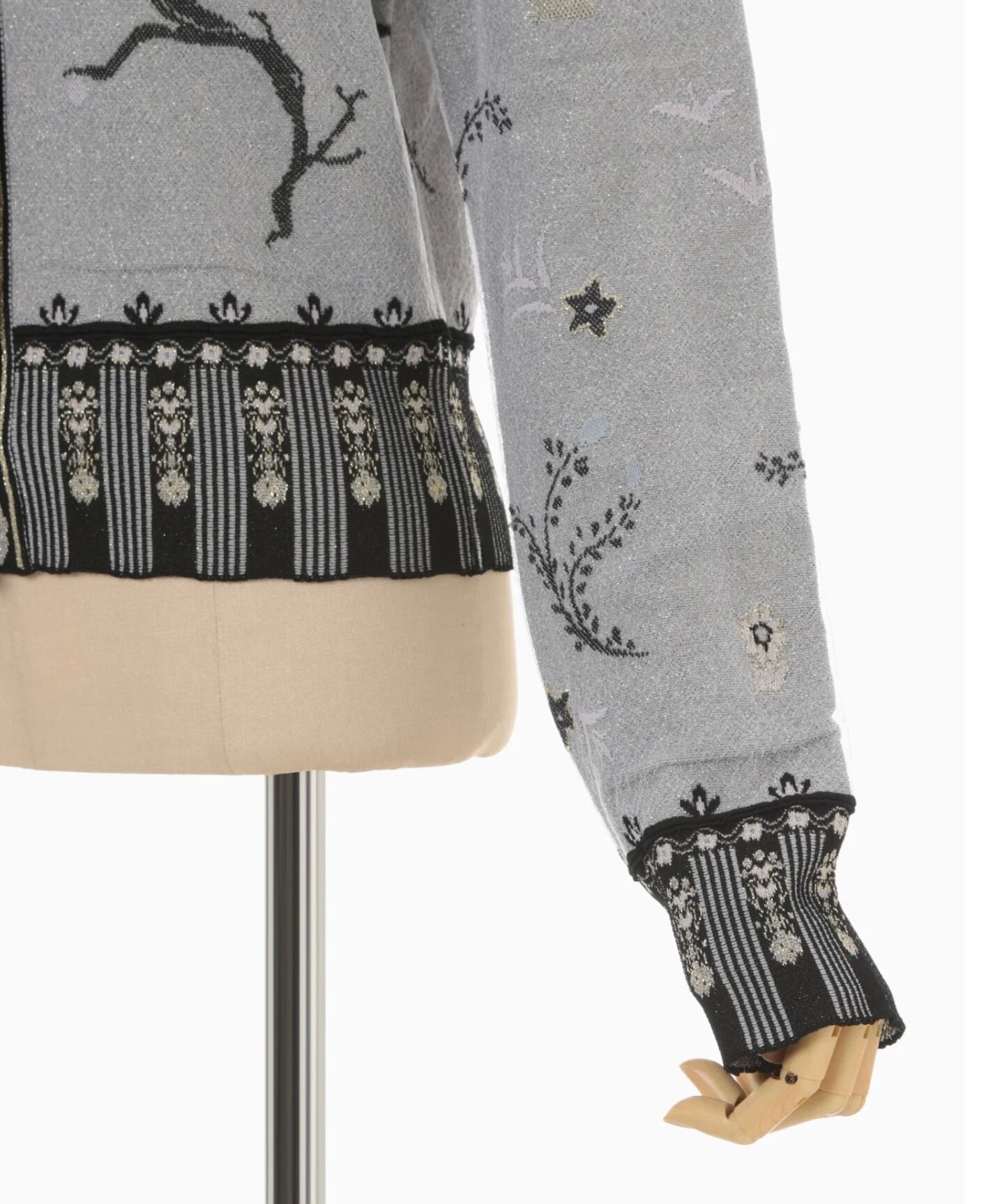 西洋のガラス工芸に見られる筆による絵付けの花柄をニットジャカードで再現。ラメ糸を用いた二重の編み地が奥行きのある表情を生み出す。コンパクトなサイジングが上品な印象を与え、細やかなディテールが随所に散りばめられた1着。