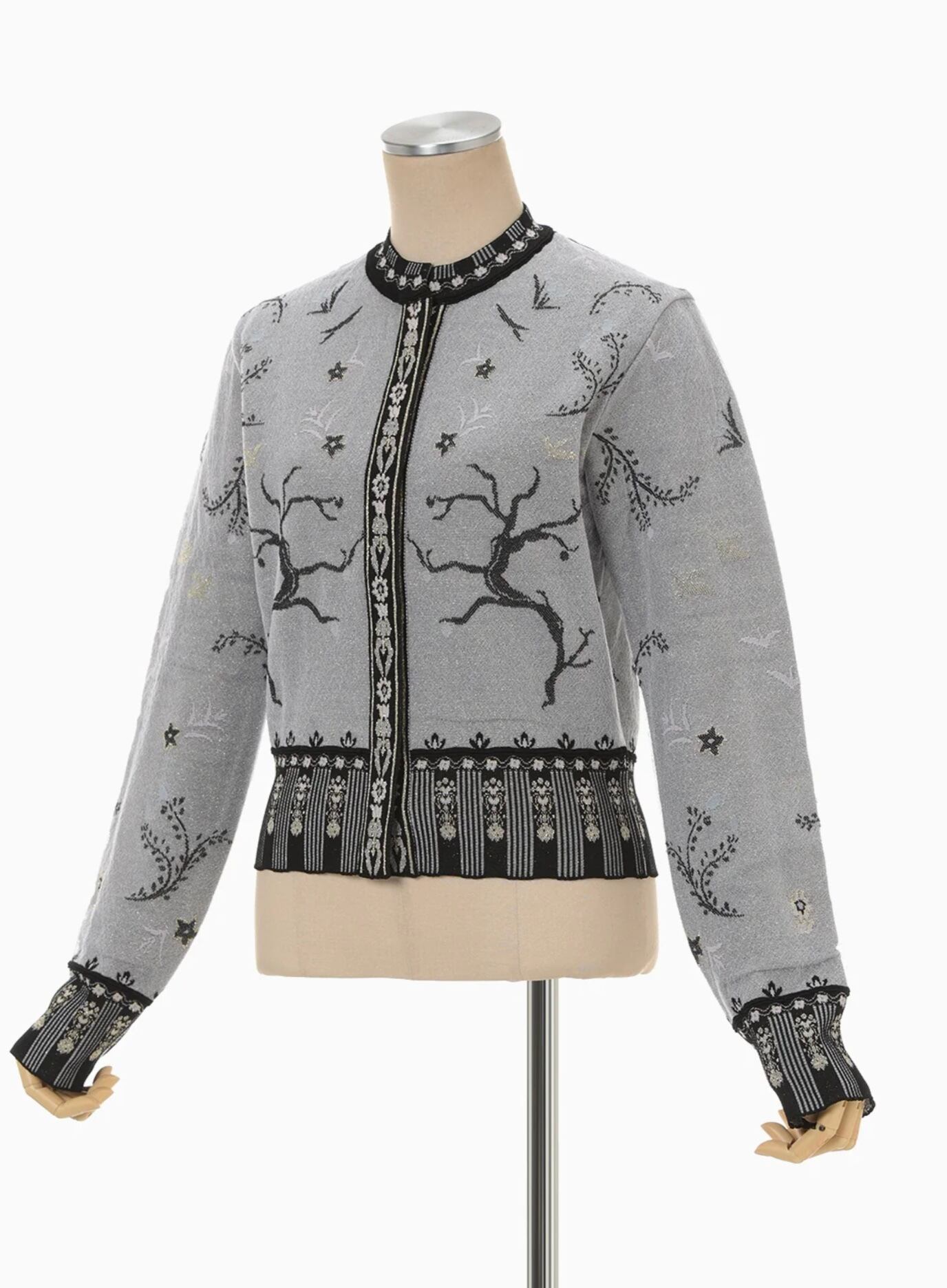 ガラスの絵付けのような繊細な柄と透け感が美しいニットカーディガン。