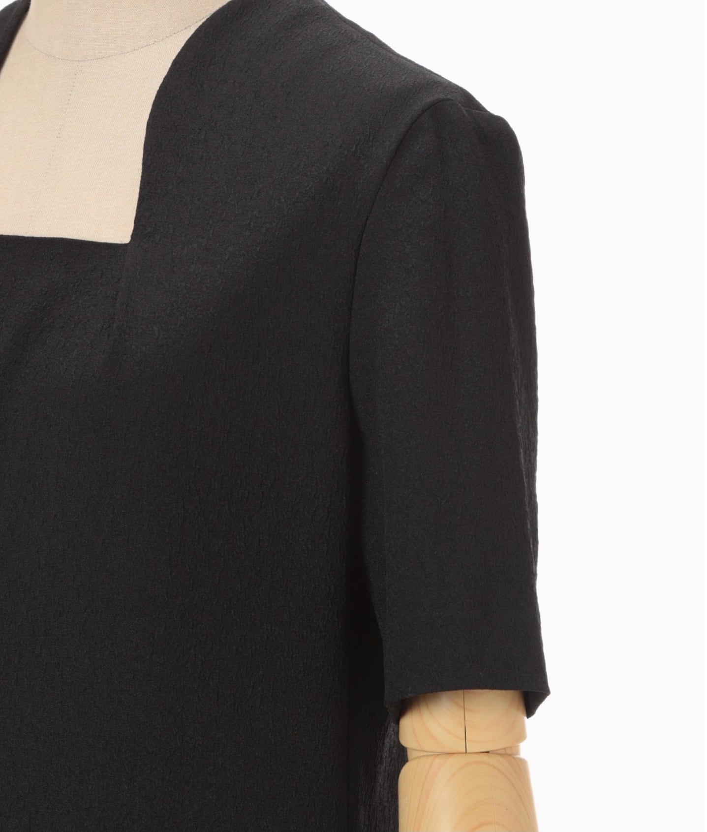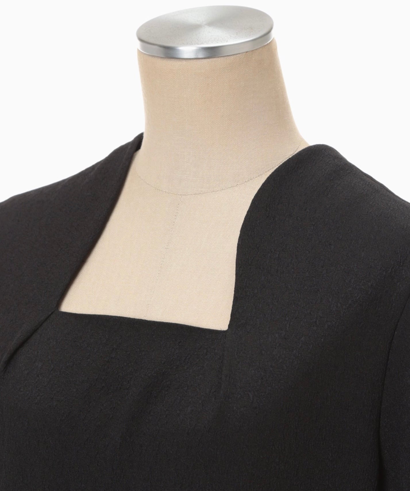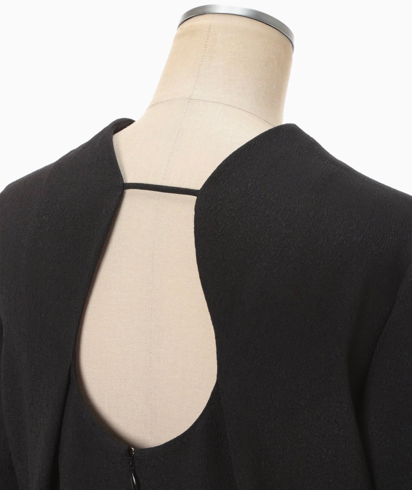 工場などで使用される表面に独特なシボ感のある不織布を花柄ジャカード生地で表現。折り畳まれた様なネックラインと大胆に開いた背中のデザインがしなやかな曲線を描きセンシュアルな印象を与える。裾のスリットに二の腕までカバーする5分袖、緻密なパターンメイキングによる立体的なシルエットがエレガントかつアクティブな1着。