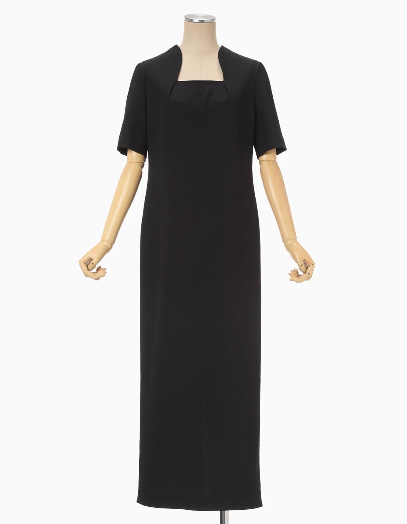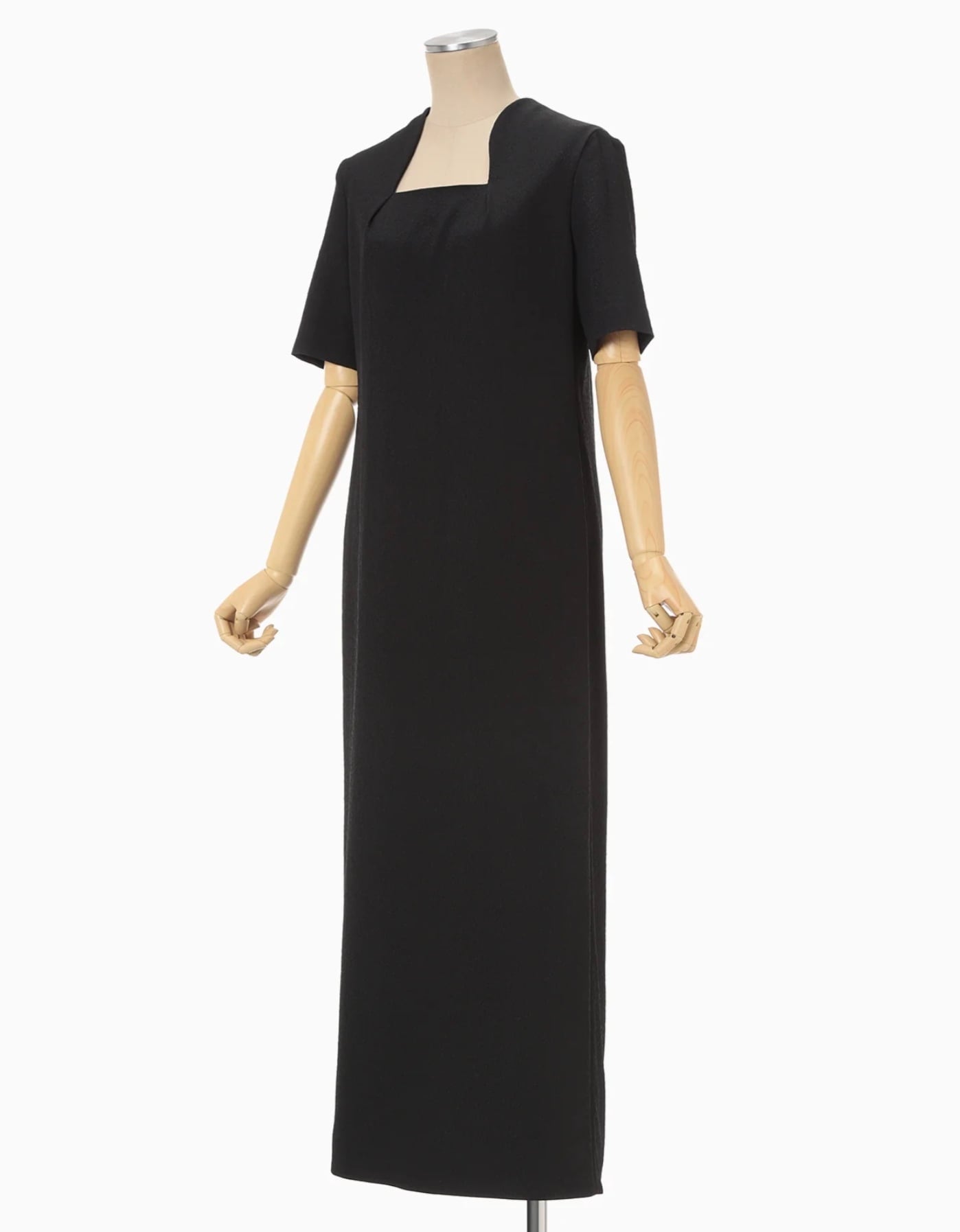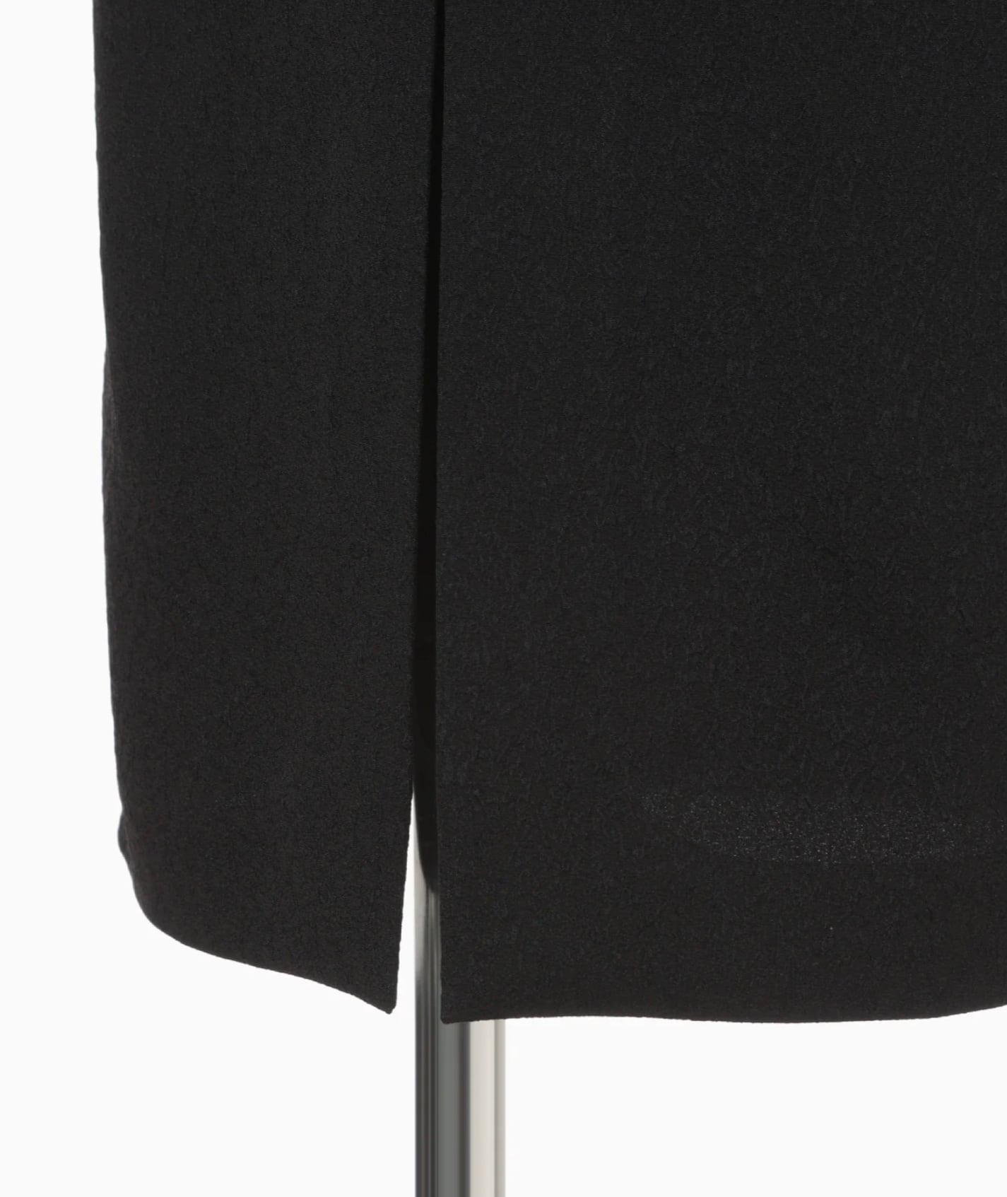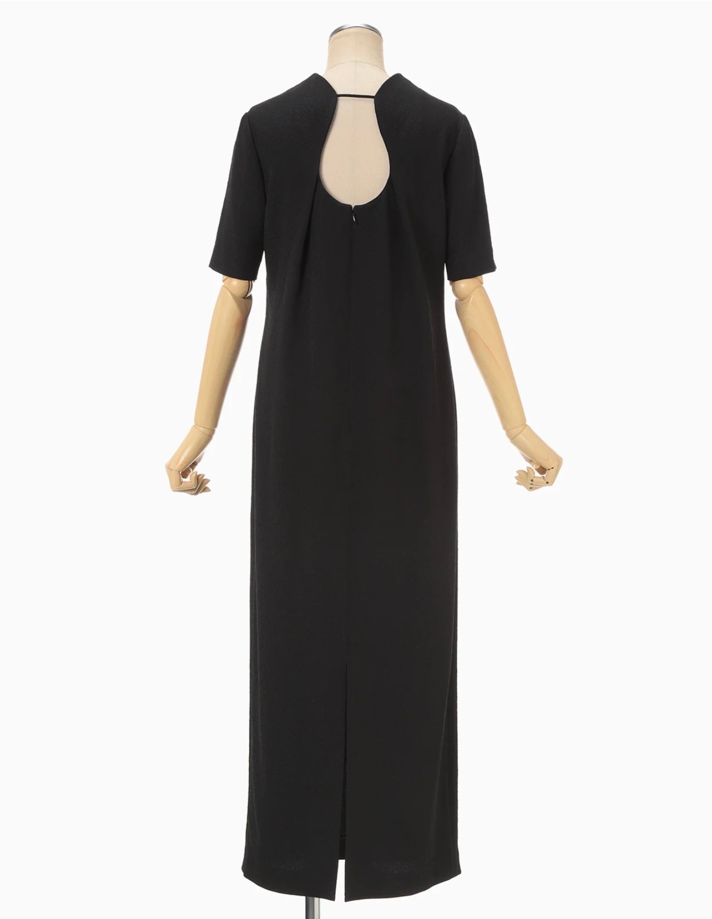工場などで使用される表面に独特なシボ感のある不織布を花柄ジャカード生地で表現。折り畳まれた様なネックラインと大胆に開いた背中のデザインがしなやかな曲線を描きセンシュアルな印象を与える。裾のスリットに二の腕までカバーする5分袖、緻密なパターンメイキングによる立体的なシルエットがエレガントかつアクティブな1着。