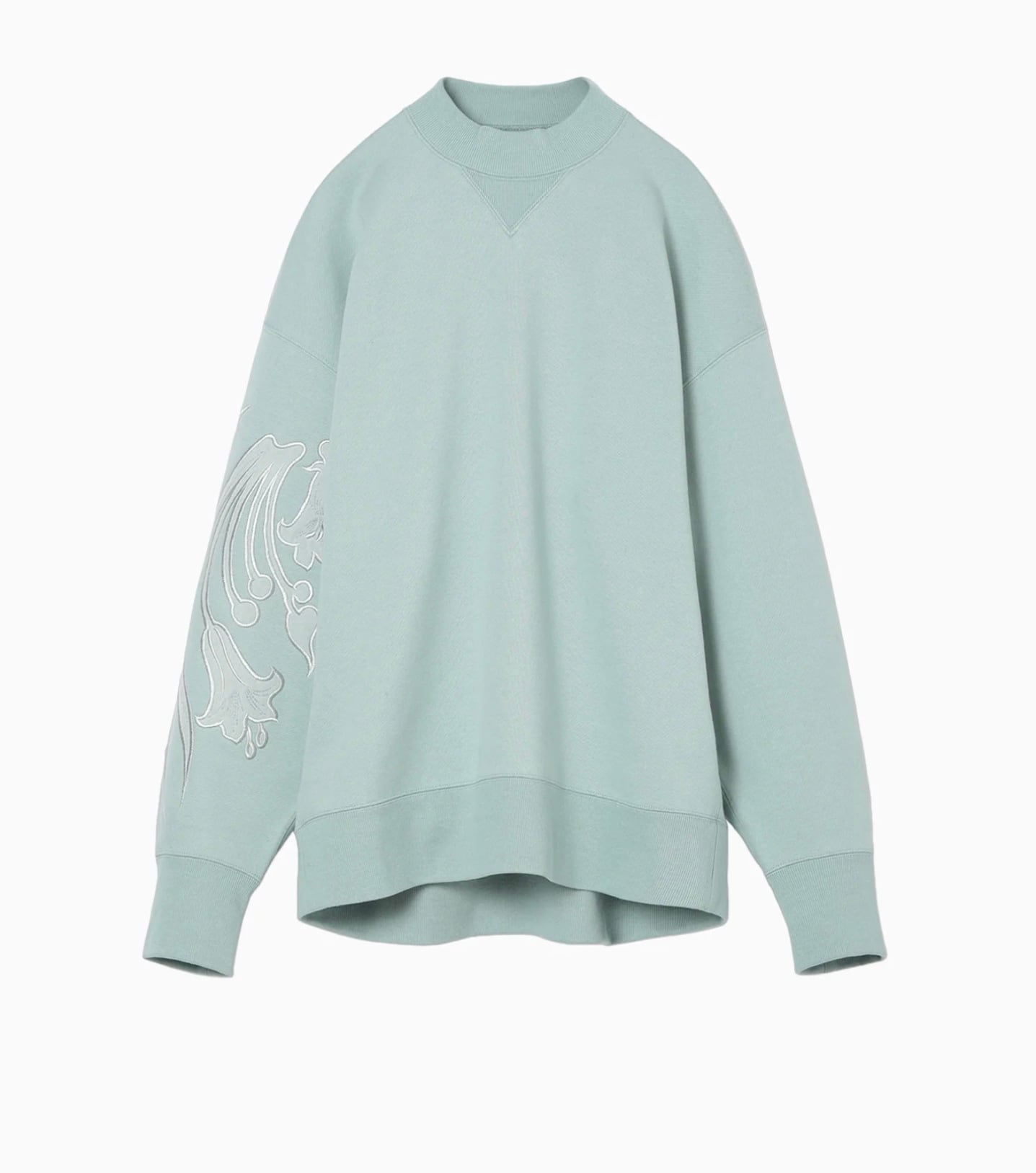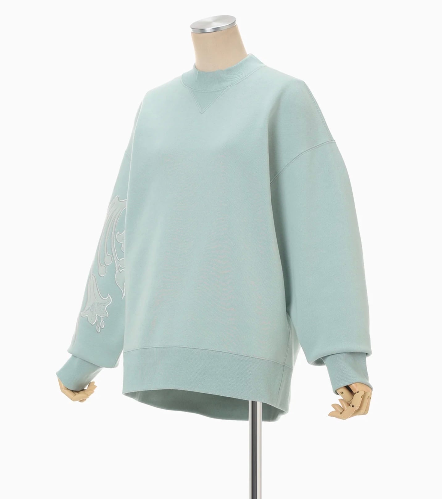肉厚なジャージー素材はハリ感のあるしっかりとした生地にシルケット加工を施すことで光沢感のある上品な仕上がりに。花柄にカットしたオーガンジーの縁を刺繍で縫い留めたアップリケ刺繍が、カジュアルさの中に繊細な気品を付与し、前後差のあるオーバーサイズのシルエットが様々なボトムと高相性。リラクシングかつ汎用性にも優れる。同素材のスカートとセットアップ着用が可能。