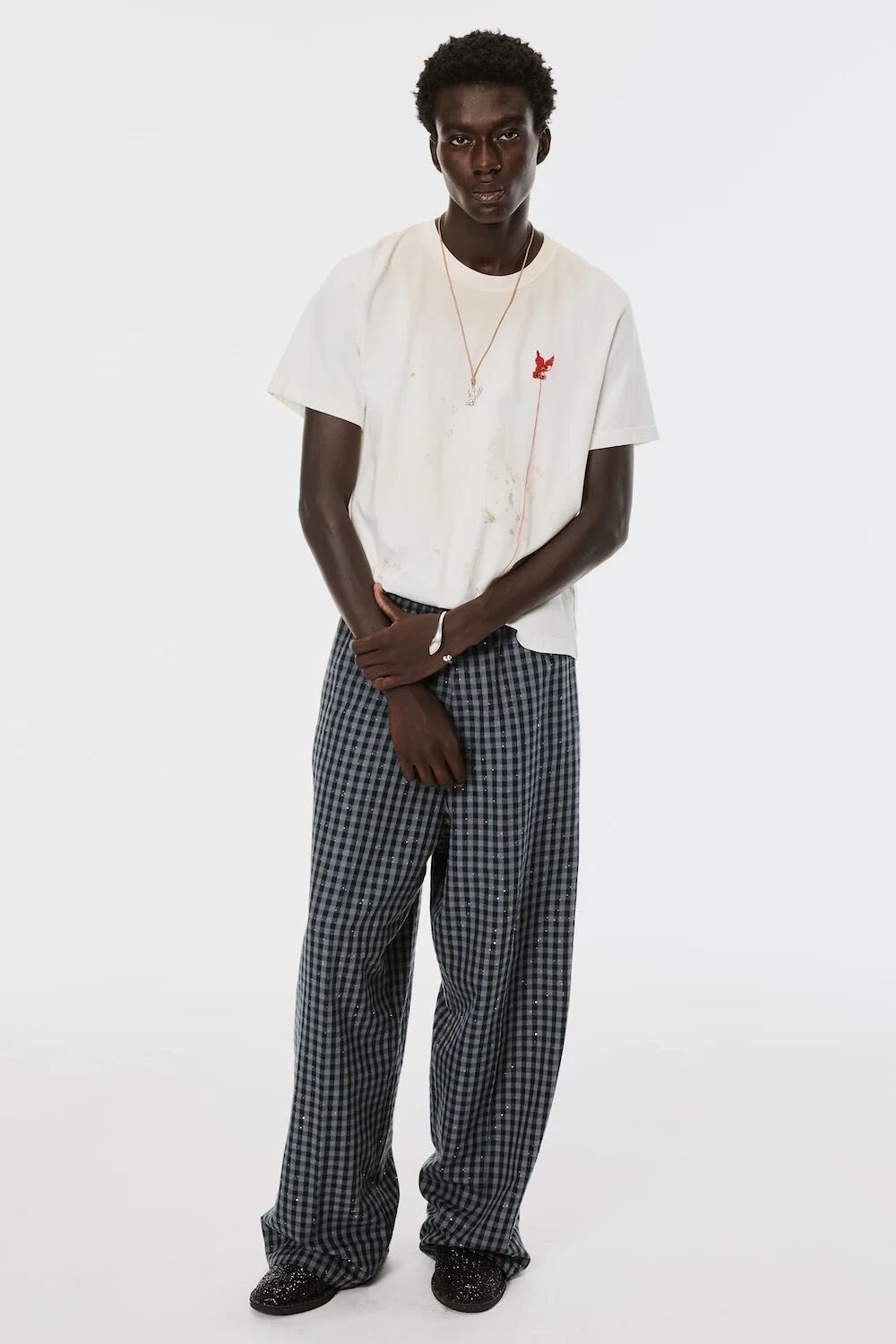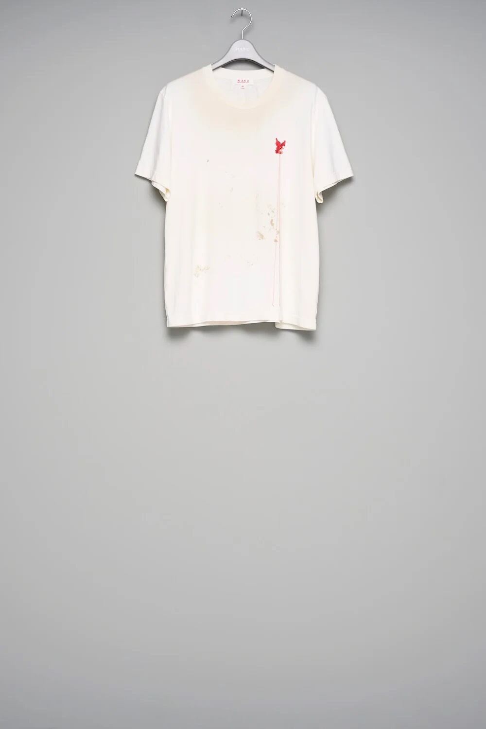 赤い欠けた天使刺繍は着用者とブランドの祈りをつなげる架け橋として表現。