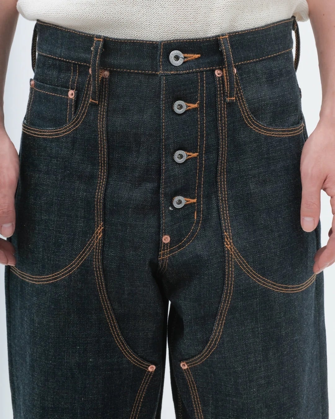 フロントフライのボタンホールを貫通、ステッチの交差。