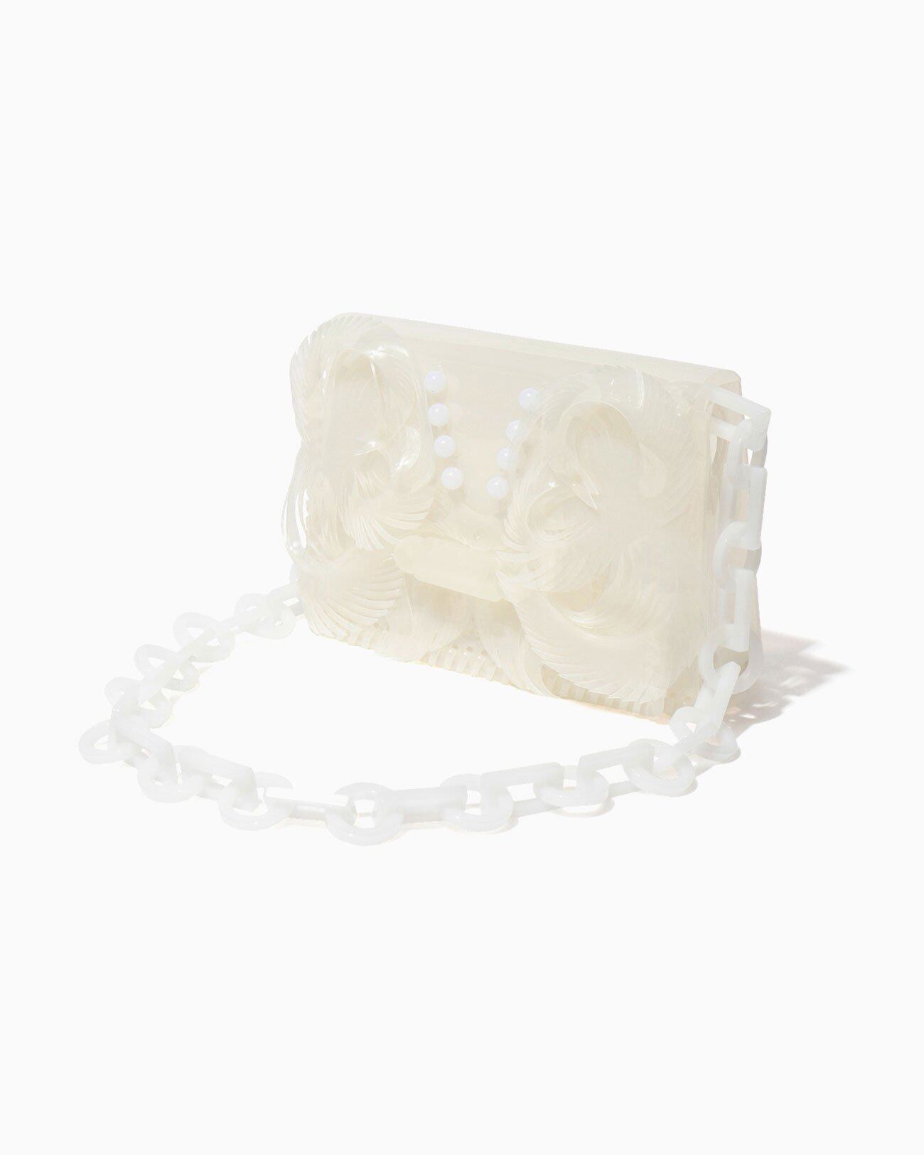 ポリ塩化ビニールを使用したアイコニックなチェーンバッグ。ポリ塩化ビニールは水道管や車のパーツに用いられ、多くは工業的に使われる。その素材の美しさに心惹かれ、デザイナー自身がカッターで切り、編み込み、モチーフを作ったのが始まり。現在では裁断、パーツ加工、成型と組み立ては全て違う工場で行われ、職人の手作業によって作られる。誰もが知っているその素材は、ガラスの様な繊細さを併せ持ち、陽の下でキラキラと輝く氷柱や氷をも連想させる。普段使う物を大胆に透けるバッグへ。立体を帯びたモチーフが日々のコーディネートを華やがせ、忽ち日常へと溶け込んでゆく。