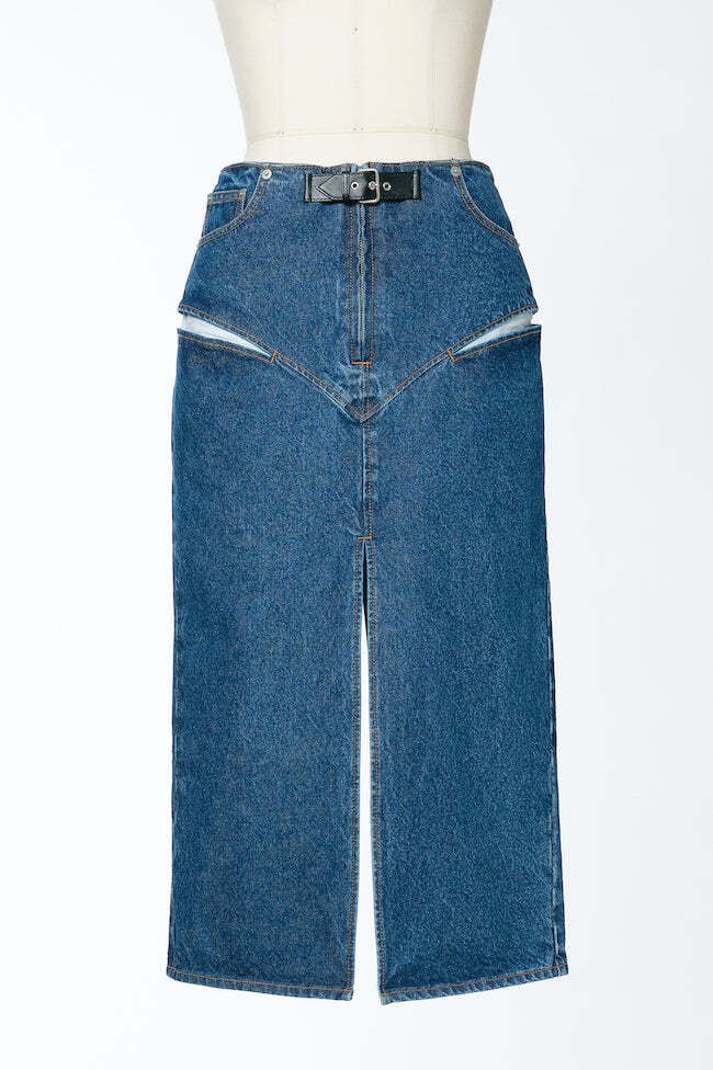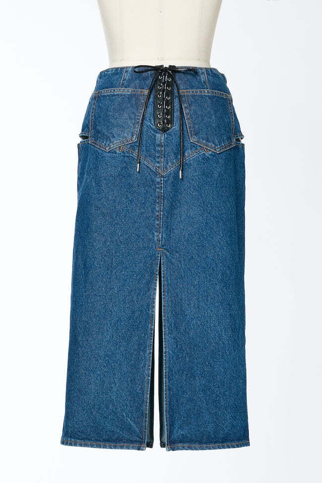 ヒップサイドのカッティングがポイントのデニムスカート。 タイトストレートのシルエットに深く入ったバックスリットが印象的です。 正面のレザーベルトと後ろのレースアップもアクセントに。